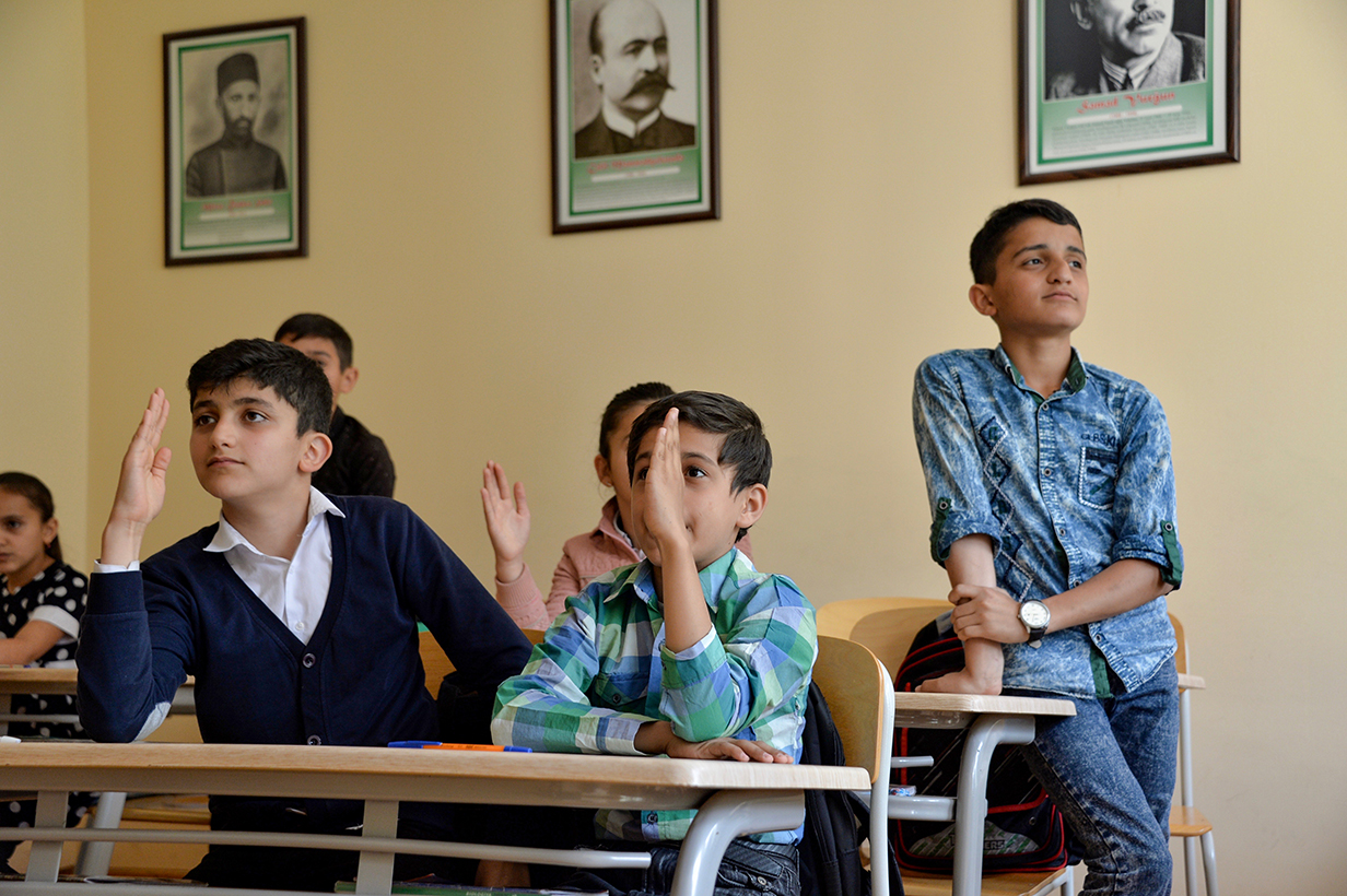 На двух снимках Онно – фрагменты из будней отремонтированной сельской школы: безукоризненно белые стены кабинета литературы – и на них портреты двух светочей с трагической судьбой, колумнистов сатирического журнала «Молла Насреддин» и поэта-флагмана Советского Азербайджана.