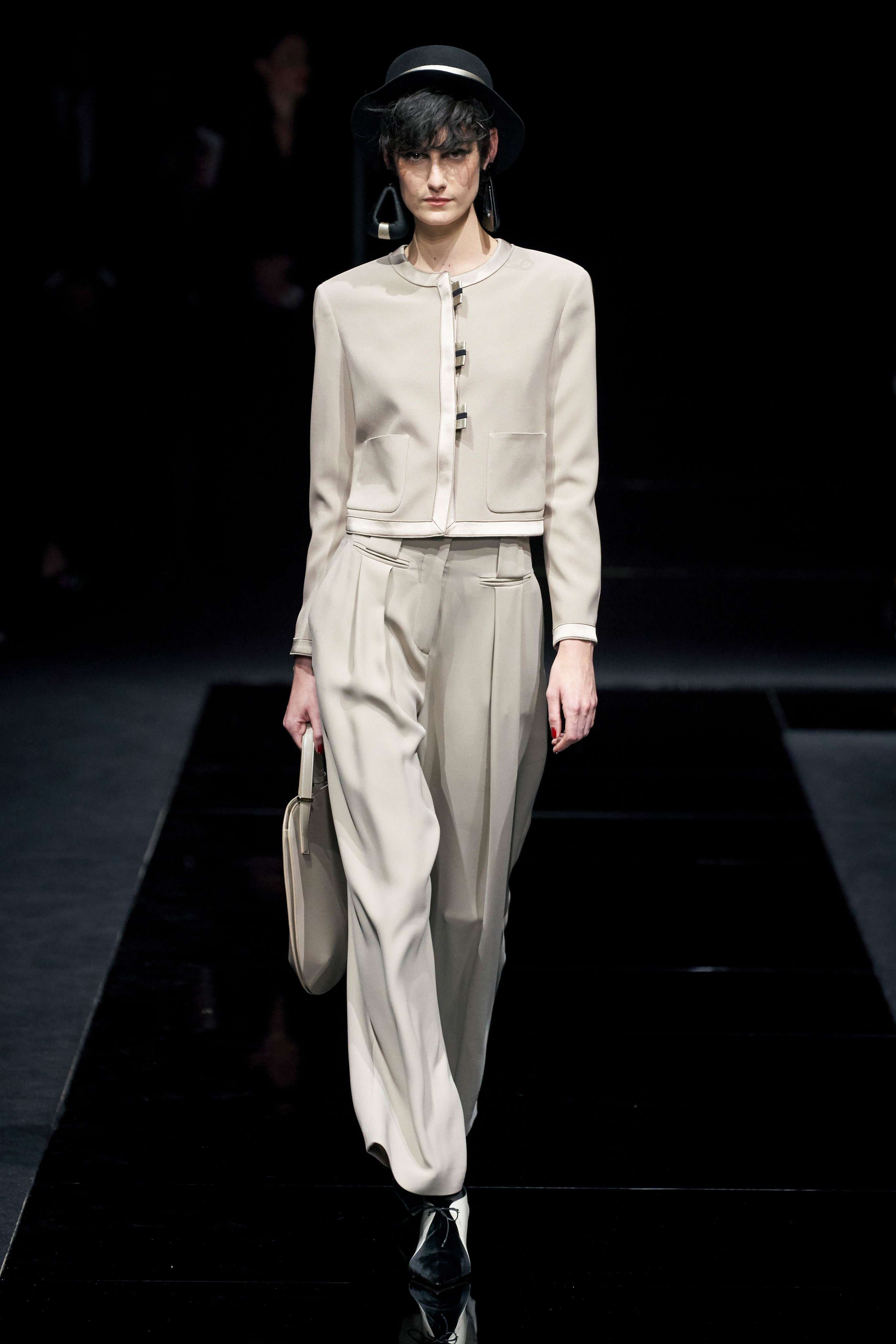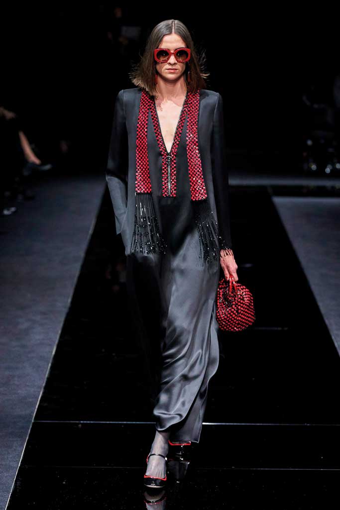Продолжился день торжественным показом коллекции Pre-Fall 2020 в Театре Armani, где над сценой парила в воздухе огромная светящаяся подпись самого маэстро. Великолепная коллекция основана на идее гармонии между чувственностью и целомудрием, между мужским и женским началами, что в единении создает стиль современной женщины.