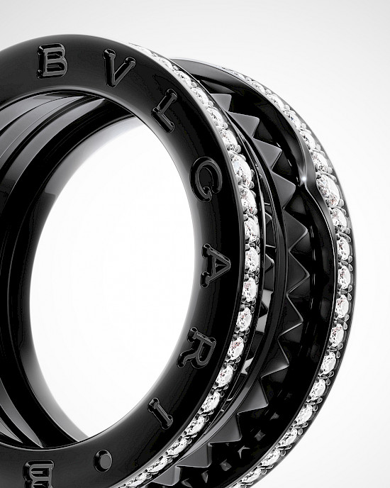 Еще сильнее нарушая условности, черное керамическое кольцо B.zero1 передаёт дерзость ярких версий в стиле рок. Выпущенное ограниченной серией в тысячу экземпляров и эксклюзивно предлагаемое в отдельных бутиках, украшение играет на эффектном контрасте: драгоценные бриллианты ободка сверкают на фоне такого нетрадиционного материала, как черная керамика. За этим стоят два года активных разработок, изобретательных адаптаций и технических экспериментов.