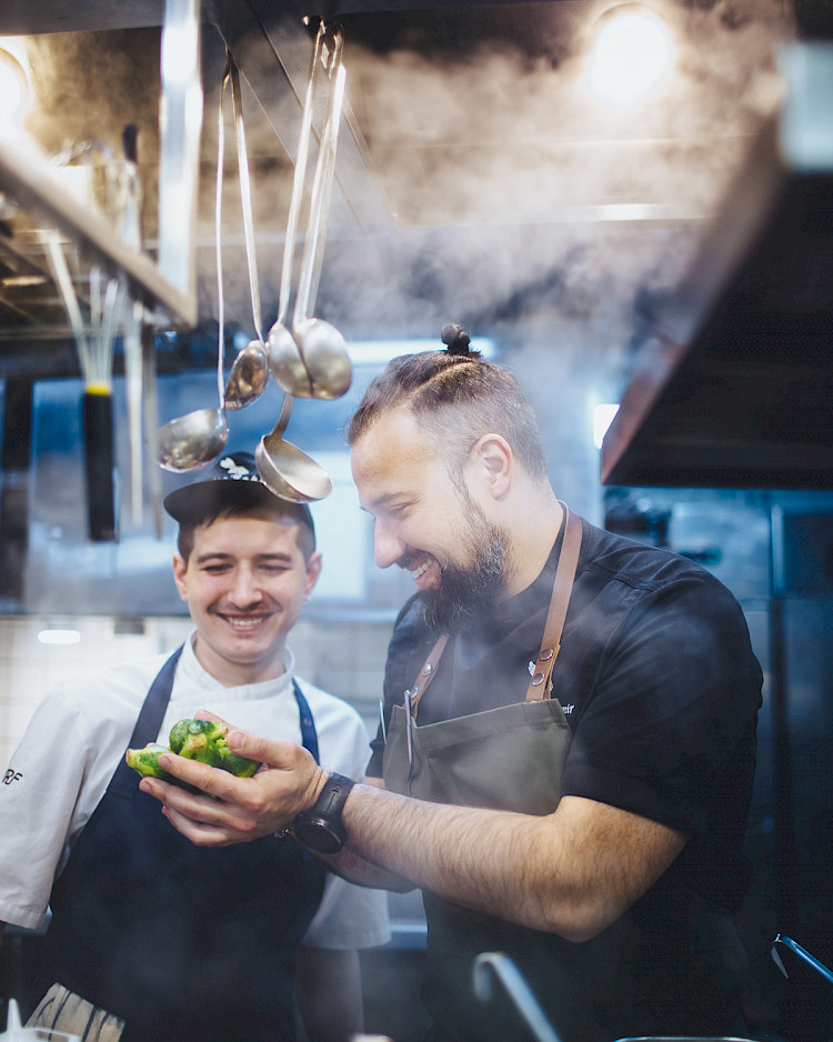 Мне думается, одним из таких блюд точно могла бы стать килька. Все привыкли, что килька – это для кошек. В сознании многих она обязательно должна быть замороженной или соленой. Но если правильно организовать процесс работы с этим продуктом от начала до конца: поймать, обработать, приготовить, создать уникальную подачу, – то килька заиграет совершенно в другом свете для каждого, кто попробует блюдо из нее! Всем, кто приезжает в Россию, также стоит попробовать бородинский хлеб. С ним мы придумали уникальную закуску на основе кокосового сала – coco lardo. Ну и, конечно, какое-то сезонное блюдо. Все зависит от того, когда посетить нашу страну. Если в мае, то, конечно же, стоит попробовать блюда со сморчками. А если в середине лета, то однозначно – чебуреки с цветами цуккини. Обязательно стоит отведать русский торт-медовик (в нашем ресторане его готовят по тому самому «бабушкиному рецепту»), мороженое из топленого творога, сырники, вареники с вишней, борщ, соленья, жареную картошку с грибами и наш фирменный капустный пирог с икрой.
