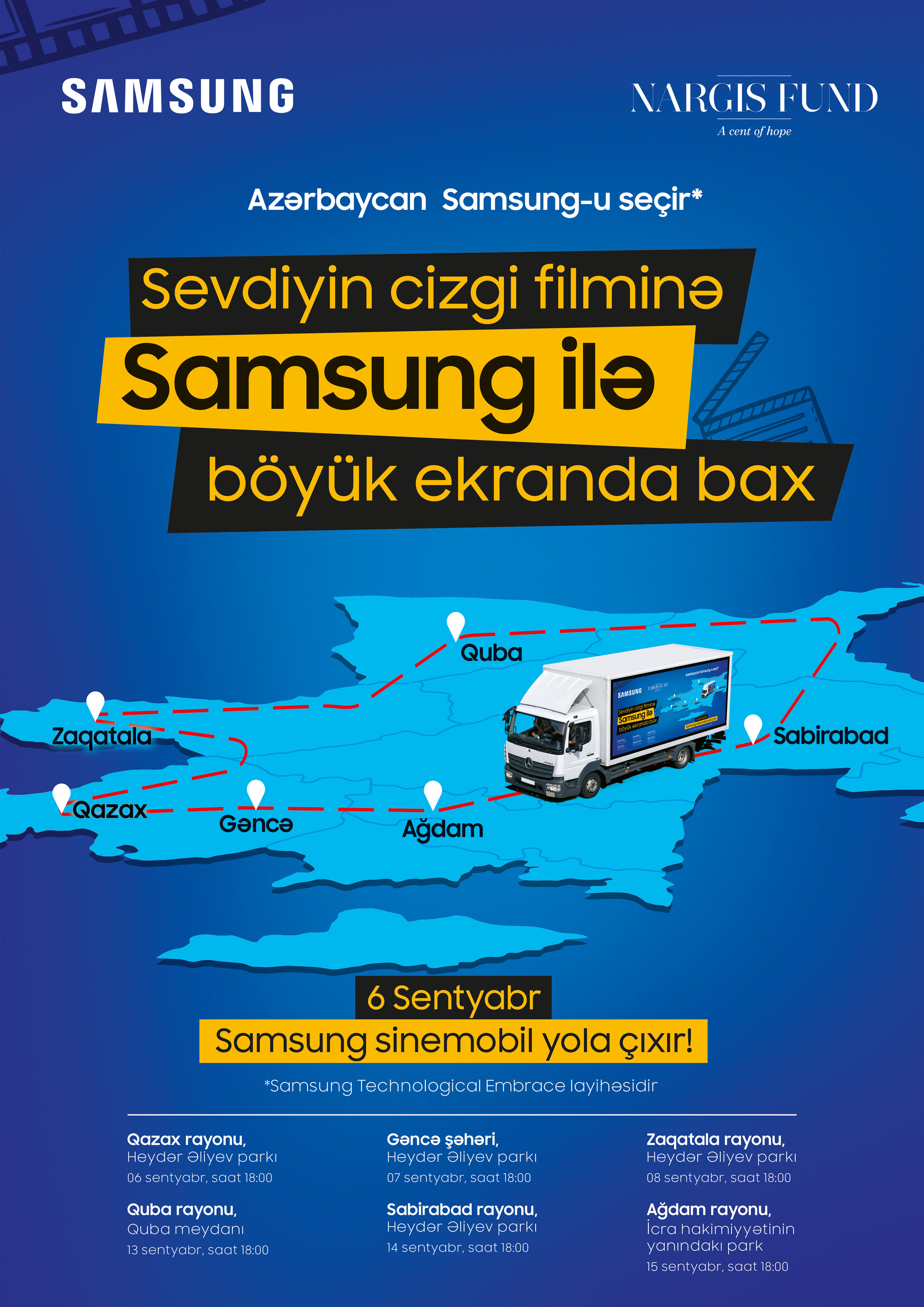 “Nargis” fondu ilə birgə öz əlli illik yubileyi ərəfəsində Samsung Azerbaijan şirkəti “Technological Embrace” adlı yeni layihəyə start verir. Layihə çərçivəsində Quba, Biləsuvar və Tovuz rayonlarının 3 məktəbində xüsusi təhsil otaqlar Samsung şirkətinin qabaqcıl texnoloji məhsulları ilə təchiz olunaraq, şagirdlərin həm təhsil prossesini yüngülləşdirəcək, həm də onların rəqəmsal texnologiya ilə tanışlığına səbəb olacaq. Həmçinin, layihə çərçivəsində Azərbaycanın bölgələrinə üz tutan “səyyar kinoteatr” turunu planlayır ki, bu turda uşaqların çox sevdiyi cizgi filmi nümayiş etdiriləcəkdir. Uşaqların maraqlı, xoş vaxt keçirmələri və müsbət enerji almaları üçün kino seanslar açıq hava şəraitində baş tutacaq. Belə ki, sözügedən bu layihənin əsas məqsədi uşaqların son tətil günlərini məmnuniyyətlə keçirmələri və yeni güclə məktəbə üz tutmalarıdır. Hörmətli valideynlər, sizi bu unikal fürsətdən istifadə etməyə və uşaqlarınıza sevinc dolu anlar yaşatmağa dəvət edirik. Qeyd edək ki, seanslar tamamilə pulsuzdur və istənilən uşaq burada seyirci olaraq iştirak edə bilər. Hər birinizə gözəl istirahətlər arzu edirik!