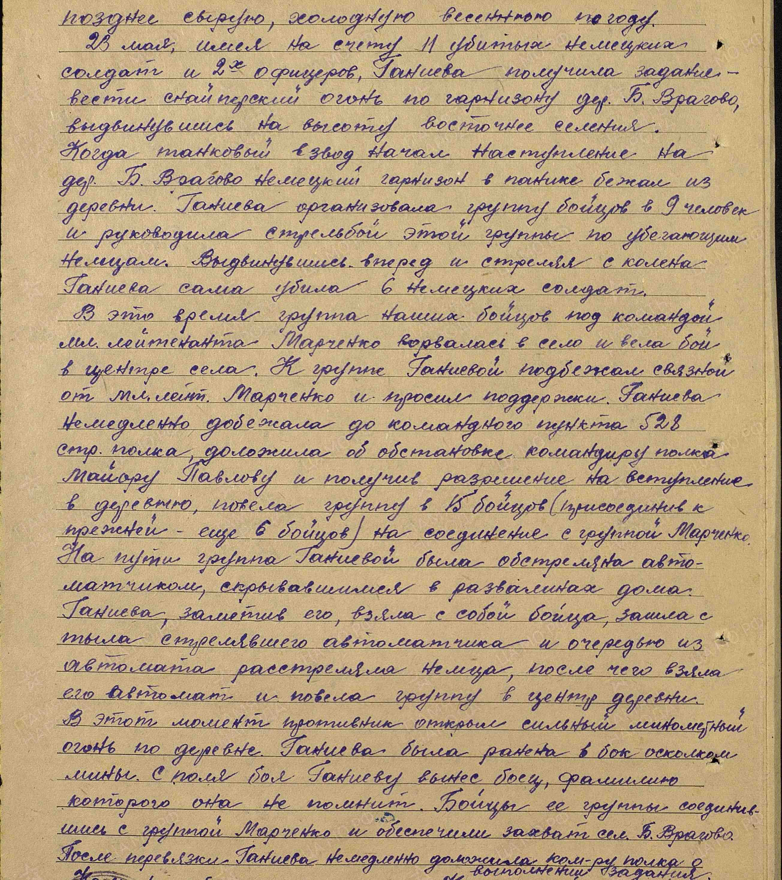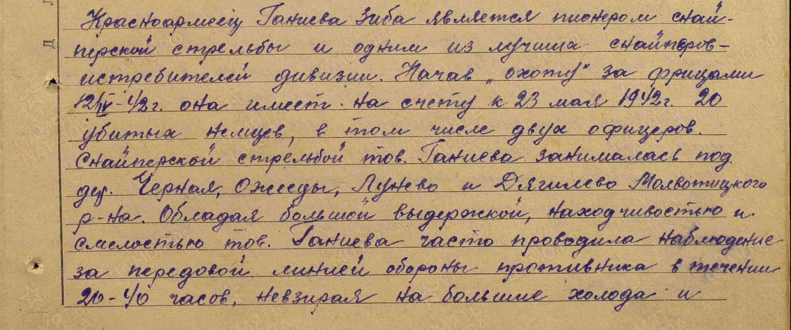 ...o, birbaşa diz çökərək atəş açacaq və altı hitlerçini vurduqdan sonra düşmən ordusu haqqında məlumat almaq üçün səkkiz saat qarda uzanacaq. Sonra isə elə orada doqquz əsgərdən ibarət dəstə quracaq və bir neçə kənddən birini işğaldan azad edəcək.