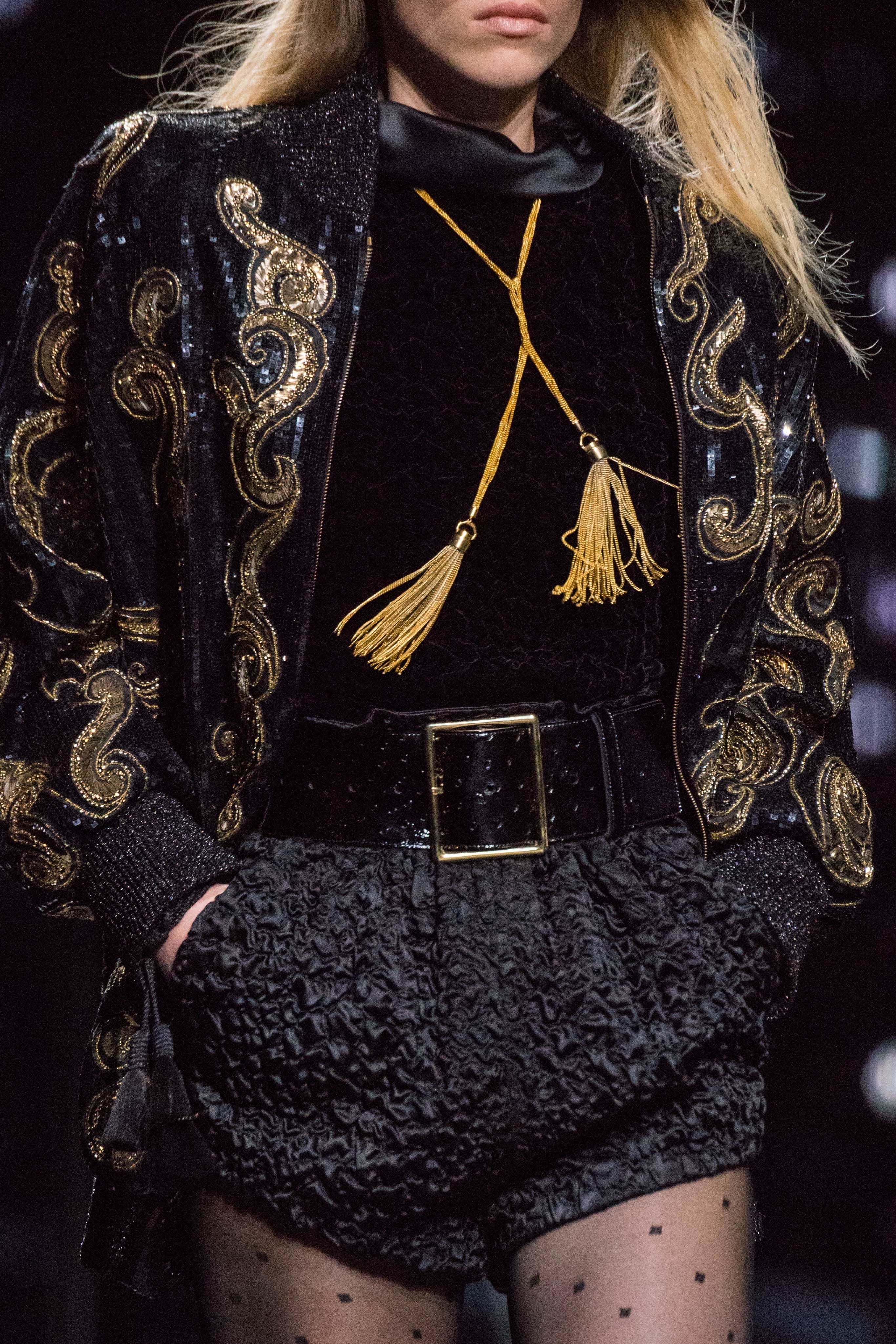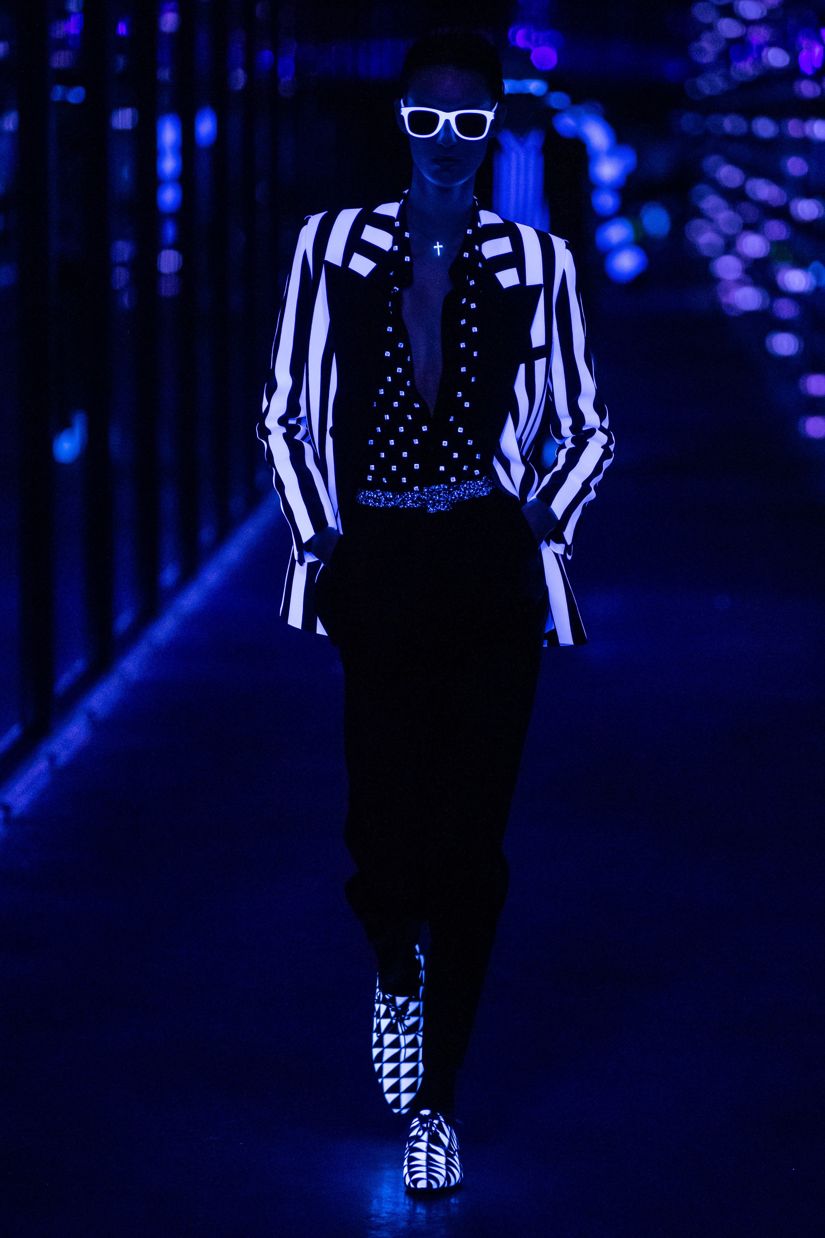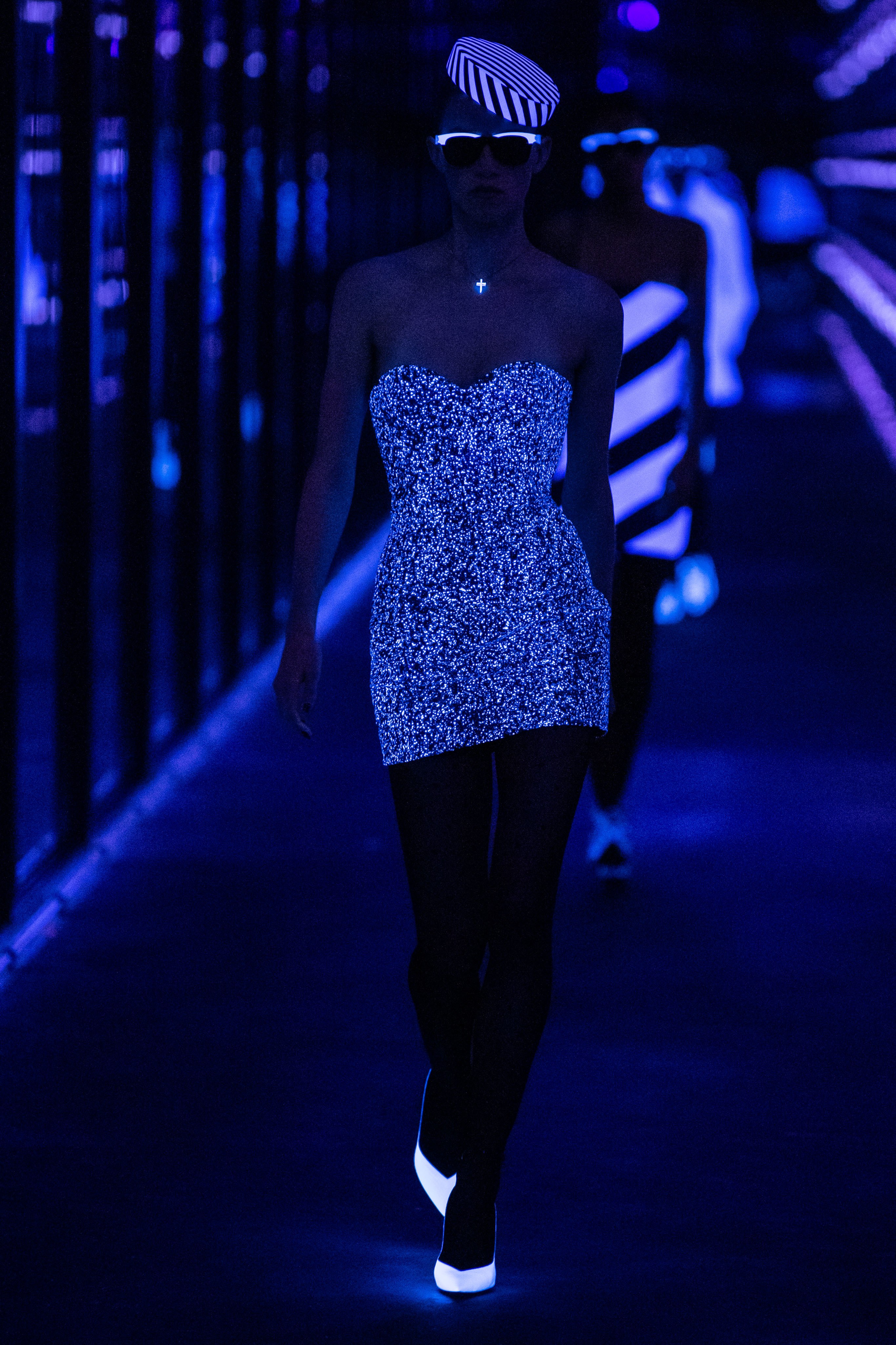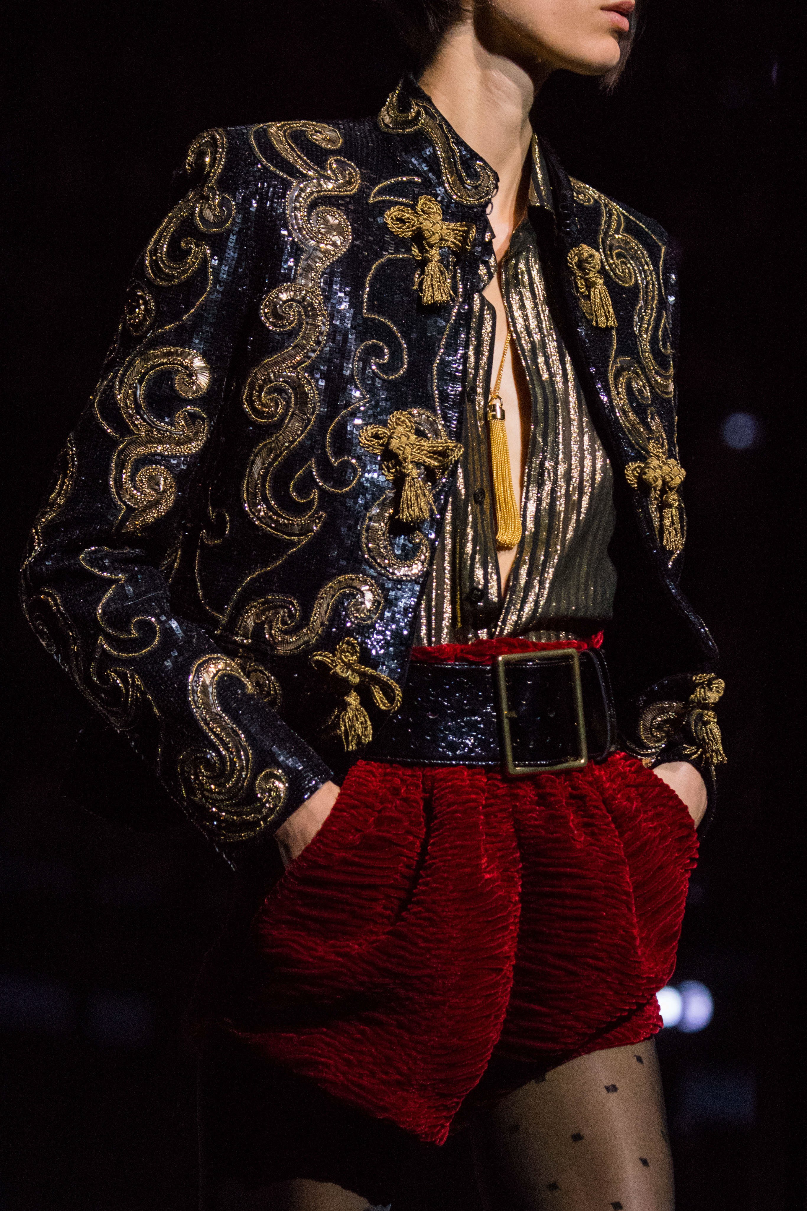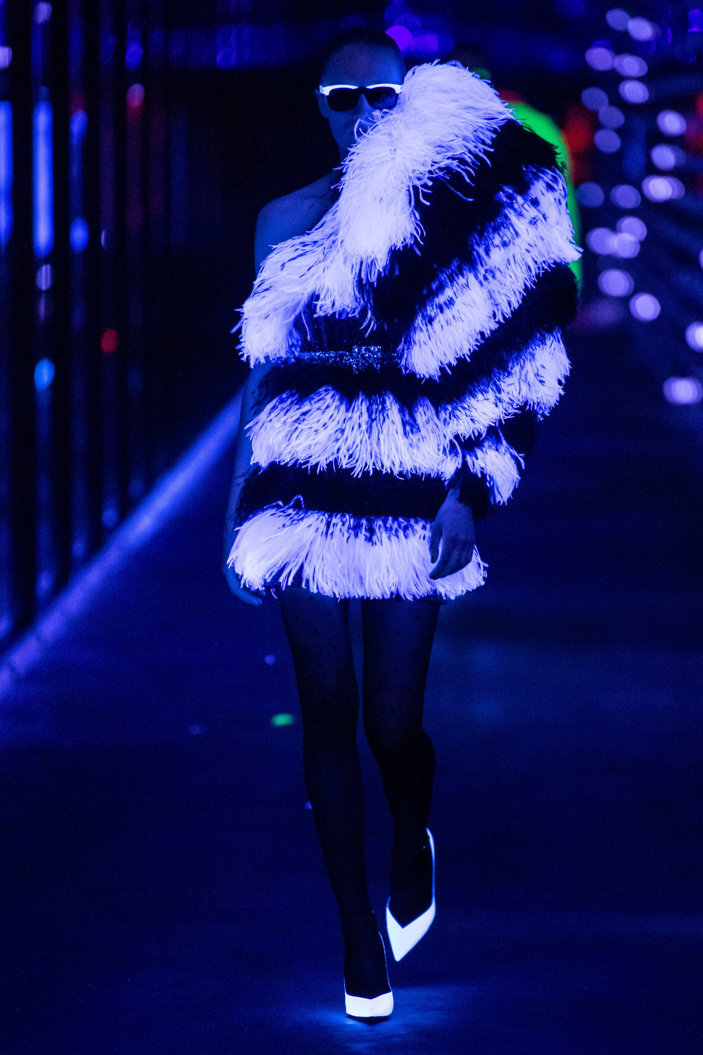 Saint Laurent brendinin kreativ direktoru Entonu Vakkarellonun payız-qış kolleksiyası 80-ci illərin modasından ilhamlanmışdır: uzun trençkotlar, böyük bantlar, ciddi kostyumlar, həcmli fənər-qolluqlar. Dizayner 80-ci illərin qollarını tikmək üçün altı ay vaxt sərf etdiyini etiraf etdi. "Kolleksiyanın bütün detalları əl ilə tikilib" – Vakkarello qeyd etdi. Nümayişin birinci hissəsi Paris gecəsi romantik bir gəzintiyə bənzəyir. İkincisi texno-rayvın tam təcəssümüdür: modellər tamamilə qaranlıq podiumda yürüdülər, eyni zamanda isə yalnız göz qamaştırıcı neon paltarları görünürdü.