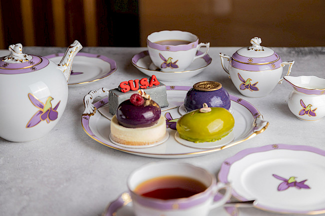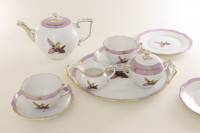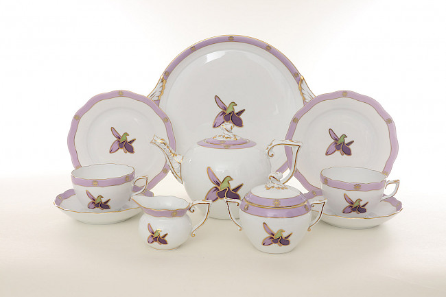 Və nəhayət, istənilən çay dəsgahını bəzəyəcək 22 əşyadan (çaydan, qənddan, süd qabı, tort qabı, həmçinin 6 fincan, nəlkbəki və desert boşqabları) ibarət gözəl Herend çay dəsti. Əl işi, incə bənövşəyi rəng və hər bir əşyanın üzərində qələbəmizin rəmzi olan xarı-bülbülün təsviri bu çay dəstini əsl sənət əsəri edir.