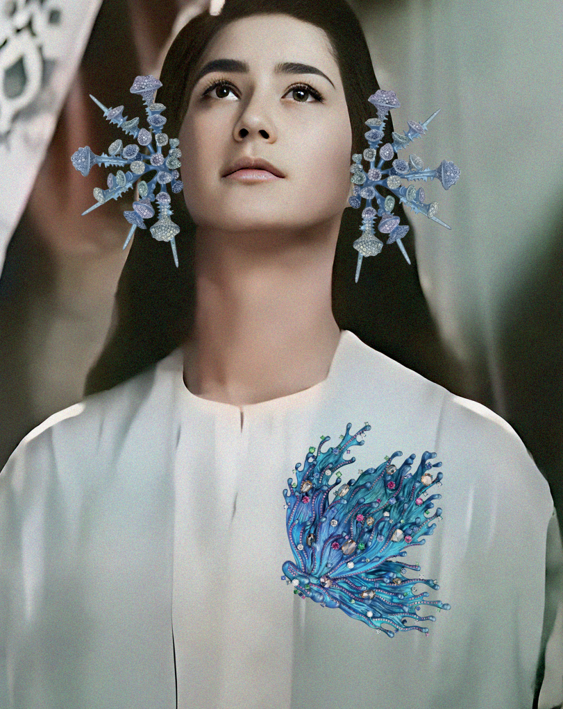 Wallis Hong “Siren” earrings / Wallis Hong “Eternal Butterfly II” brooch / Wallis Hong “Urchin” ring
