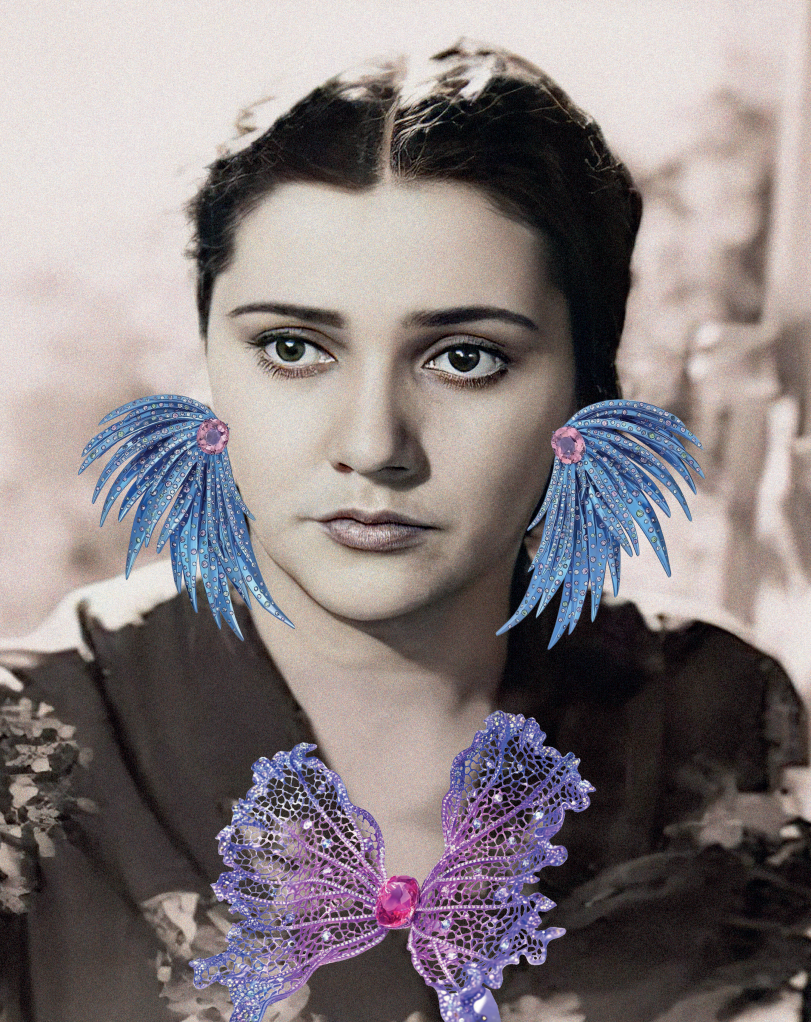Wallis Hong “The Dreams” earrings / Wallis Hong “Eternal Butterfly” brooch