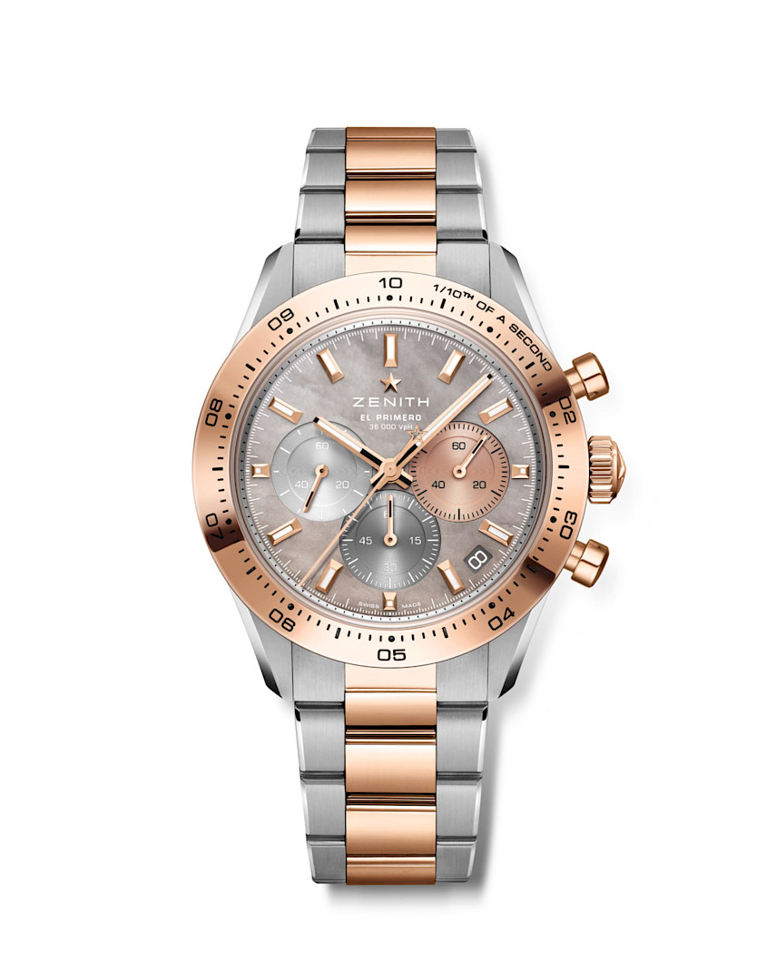 The limited-edition Chronomaster Sport unites steel with 18-carat rose gold in a refined two-tone design. Its mother-of-pearl dial frames the El Primero 3600 movement, delivering precision to 1/10th of a second. It is a 41 mm creation designed for modern, versatile lifestyles.
