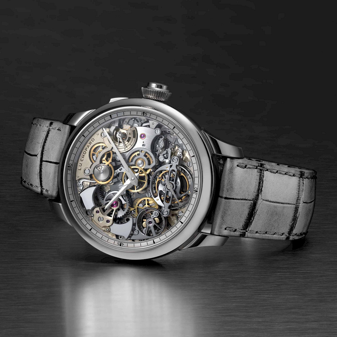 The L.U.C Grand Strike showcases a 686-component calibre with grande and petite sonnerie functions and a minute repeater, delivering exceptional acoustic performance.