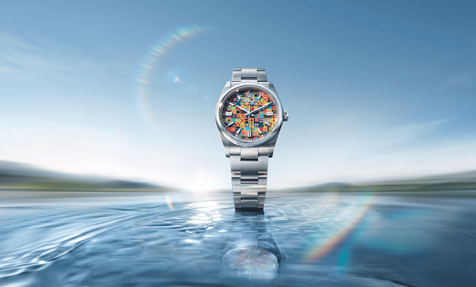 The Oyster Perpetual 36 features a multicoloured lacquer dial with a Jubilee motif, forming a vibrant and sophisticated composition.