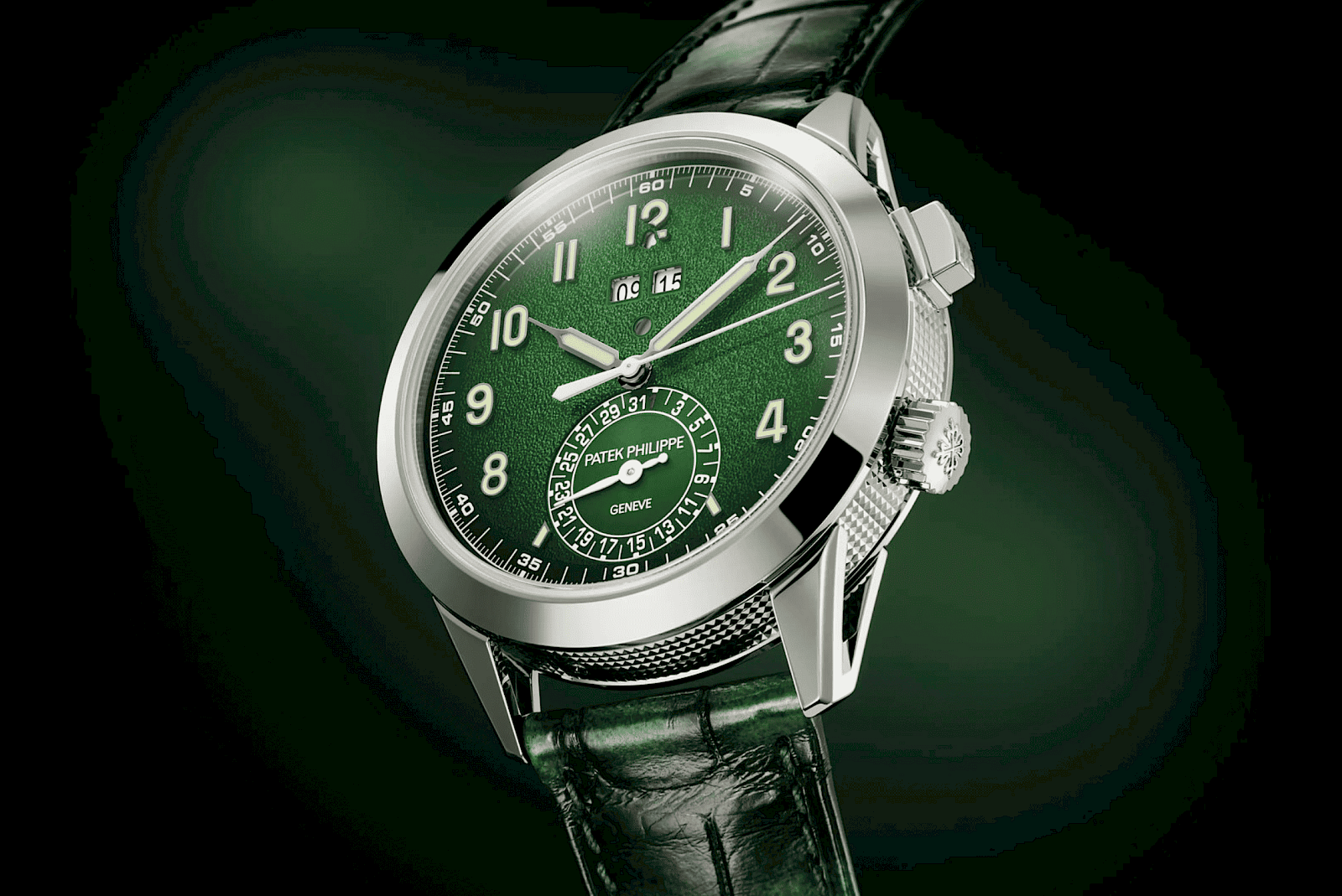 The Ref. 5322G-010 features a 24-hour alarm complication within a white gold case, combining contemporary design with traditional craftsmanship.