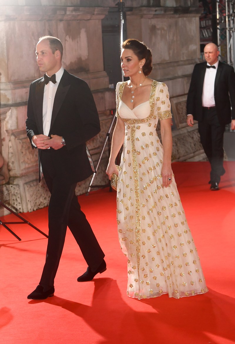 Kate Middleton's dress, created by Sarah Burton for Alexander McQueen, we had already seen on the Duchess during her official visit to Malaysia in 2012, hence the gold-embroidered hibiscus, the symbol of Malaysia. The Duchess only picked up new accessories to the dress – jewelry from Van Cleef & Arpels.