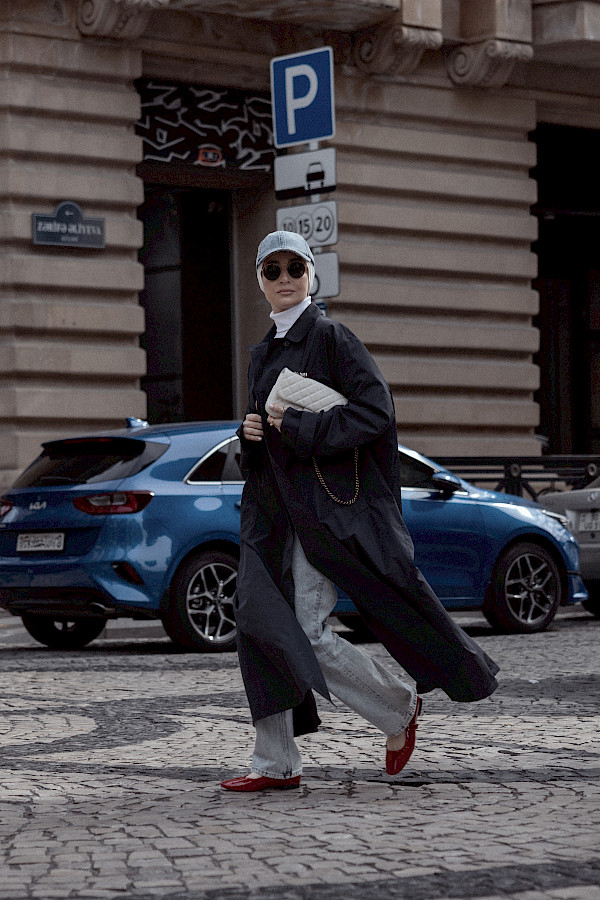 Trench coat MIU MIU, jeans and red ballet flats BEAUTY OMELETTE, bag CHANEL