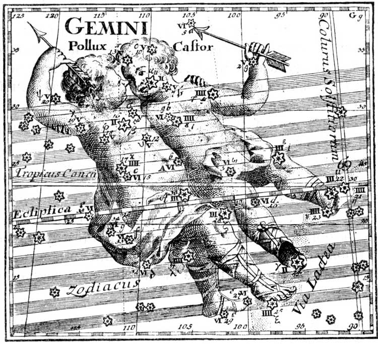 Символ этого знака напоминает римскую «двойку» II и изображает пару братьев, объединенных бесконечной дружбой. У разных народов они носили разные имена, но всегда это были два брата, разлученные и стремившиеся соединиться. Дуги вверху и внизу значка – тянущиеся руки, сам же знак Близнецов, согласно медицинской астрологии, «заведует» именно верхними конечностями. Этот знак связывают с легендой о Диоскурах – Касторе и Поллуксе, сыновьях Леды (от разных отцов, хоть и близнецы, – в мифах бывает и не такое!). Когда Кастор, рожденный от смертного – мужа Леды, царя Тиндарея – погиб в бою, Поллукс, сын самого Зевса, просил отца лишить его бессмертия, не желая пережить брата. И тогда Зевс разрешил им жить поочередно то в царстве мертвых, то на Олимпе. В основу легенды о разлученных братьях мог лечь и астрономический факт: одна из двух самых ярких звезд созвездия Близнецов – Кастор – видна утром, а другая, Поллукс, вечером.