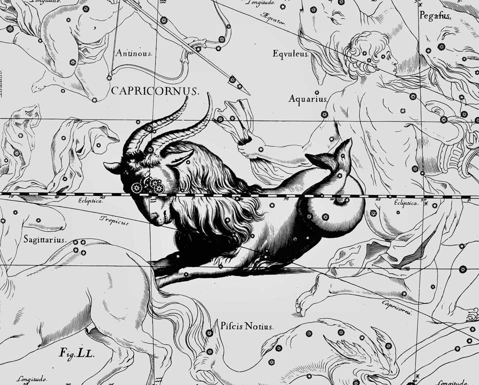Как и в случае со Львом, в символе Козерога многие усматривают изображение того существа, чье имя носит этот знак. Правда, тут значок позаковыристее, ну так ведь и существо гораздо более причудливое. Согласно античной легенде, бог лесов, козлоногий Пан однажды играл на свирели на берегу реки, и как раз в это время Зевсу и Тифону, чудовищу с сотней драконьих голов и змеями вместо ног, вздумалось устроить там свой поединок. Великан Тифон был очень страшен. Увидев его, Пан издал жуткий вопль и со страху кинулся в реку: он умел превращаться в рыбу и надеялся улизнуть. Но по какой-то причине бедняга застрял в промежуточном состоянии – верхняя половина его тела осталась козлоподобной, хотя нижняя успела превратиться в рыбий хвост. Однако его крик ненадолго отвлек Тифона, что дало Зевсу возможность выхватить свое грозное оружие – молнии, чтобы испепелить противника. В благодарность за это Зевс и вознес видоизмененного Пана на небо.