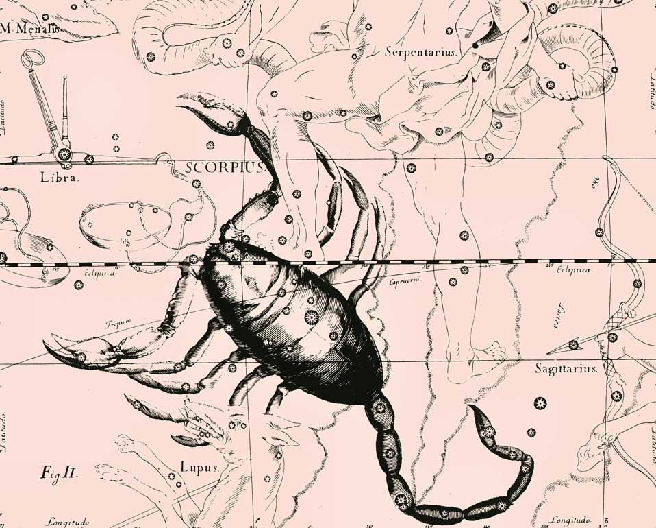 Это созвездие тесно связано с другим, не зодиакальным – Орионом. Легендарный охотник Орион вел бурную личную жизнь, из-за чего, собственно, и погиб, пронзенный... а вот чем именно и почему – о том версий много. По одной из них, охваченный страстью Орион погнался за сестрами Плеядами, причем сразу за всеми семью, и тогда боги натравили на него гигантского Скорпиона, который и ужалил его в ногу (на звездных картах Ориона рисовали обращенным к нему ногами). Другая версия связана с богиней охоты, девственной Артемидой: к ней Орион якобы тоже подкатывал, но погиб от ее стрелы. Таким образом, «хвост» символа со стрелкой изображает не то жало Скорпиона, не то стрелу Артемиды, но в любом случае – нечто смертоносное. Остальная же часть значка, напоминающая латинскую букву m, представлялась многим астрологам античности не чем иным, как ногами Ориона, к которым подбирается Скорпион, чтобы ужалить.
