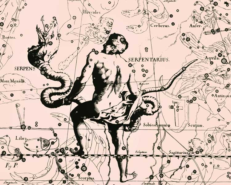 В зодиакальном круге есть и тринадцатый, скрытый знак – это Змееносец. Его действие длится примерно с конца ноября до середины декабря. С ним связана античная легенда о божественном врачевателе Асклепии (у римлян Эскулап), сыне Аполлона, умевшем оживлять мертвых (по другой версии – только пытавшемся оживить убитого Ориона). Зевс разгневался на такую дерзость и сразил его молнией, но потом смилостивился и вознес Асклепия на небо, а кентавр Хирон отдал ему свое бессмертие. Змея в руках Асклепия – символ врачевания – отражена в символе этого созвездия, изображающем человека со змеей в руках. Жрецы майя видели в этом созвездии летучую мышь, а в иранской мифологии с ним связан описанный в «Авесте» трехголовый змеиный царь Даххак. Считается, что в дни Змееносца человек может вырваться из замкнутого круга привычных проблем и пойти на взлет, преобразив этот круг в спираль, устремленную ввысь.