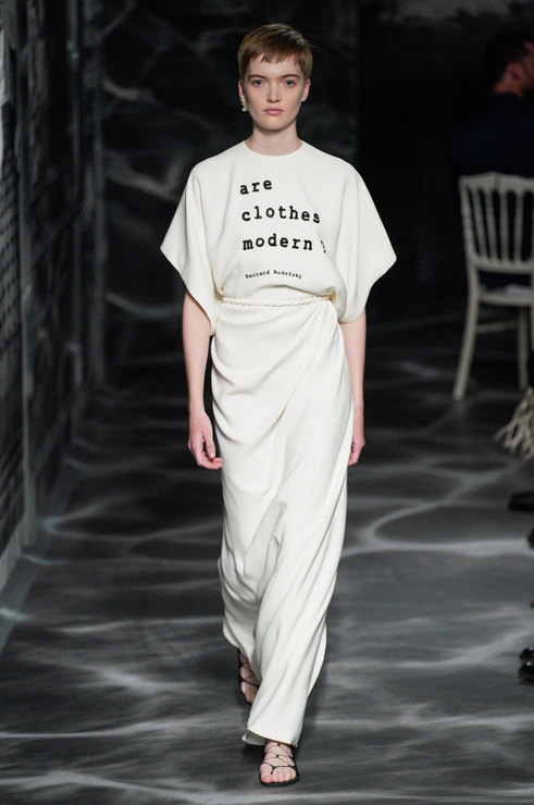 Неделя высокой моды во французской столице в самом разгаре! Одной из самых впечатляющих коллекций, которая больше всех запомнилась модной публике стала коллекция Марии Грации Кьюри для Dior. Красота и глубокая философия - вот главные отличительные черты новых творений Марии. Впрочем, как и всегда! Показ открылся футболкой с названием эссе Бернарда Рудофски «Are clothes modern?» Далее по подуиму дефилировали модели в струящихся блестящих платьях и длинных юбках с защипами, которые стали живым воплощением греческих кариатид. А вот завершился показ весьма эффектно и интригующе - на подиум вышла модель, которая несла на себе уменьшенную версию бутика Dior на авеню Монтень.