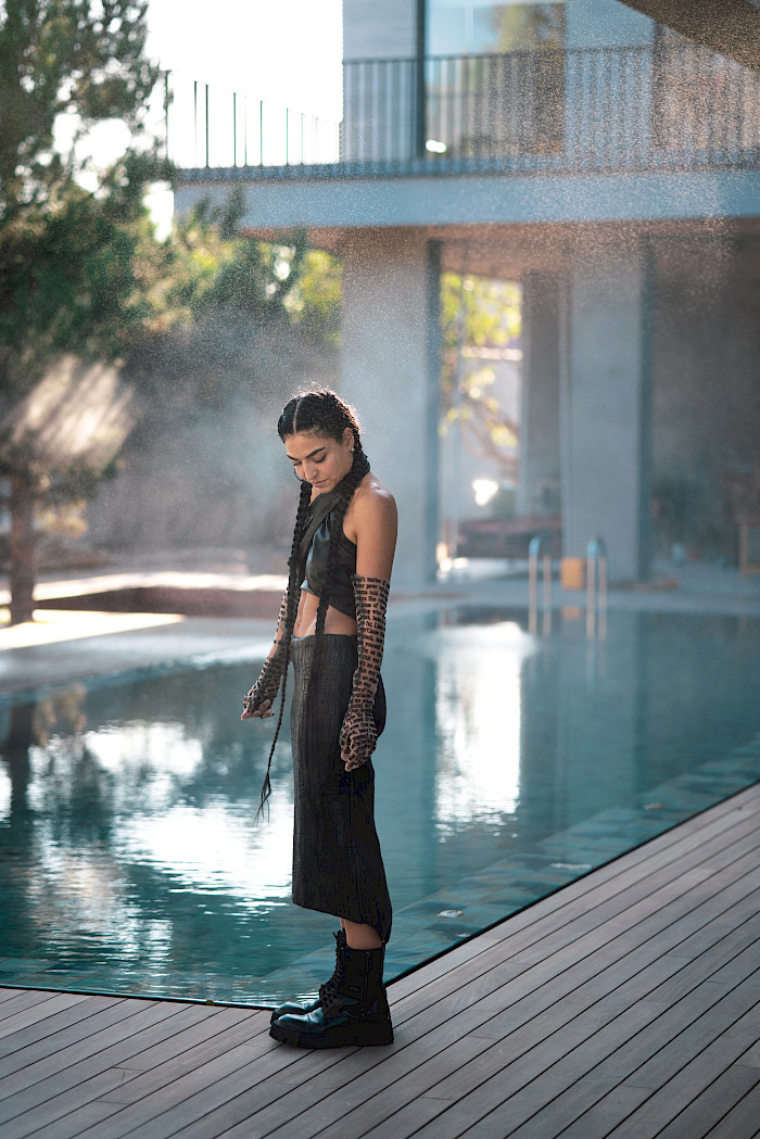 Skirt and boots BALENCIAGA, gloves DATT, top WONDERWANDERSHOP