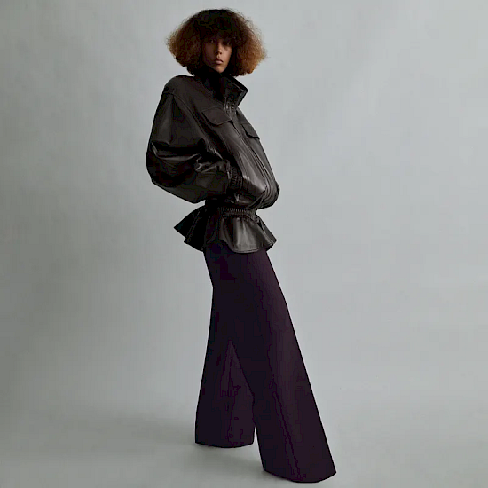 Дизайнер создала несколько эксклюзивных фасонов кожаных курток для своей новой коллекции: кожаный блузон с накладными манжетами и большим остегивающимся кожаным шарфом, классическую куртку с кожаной бахромой на рукавах и куртку из плотной кожи с высоким воротником, большими широкими плечами и заниженной талией.