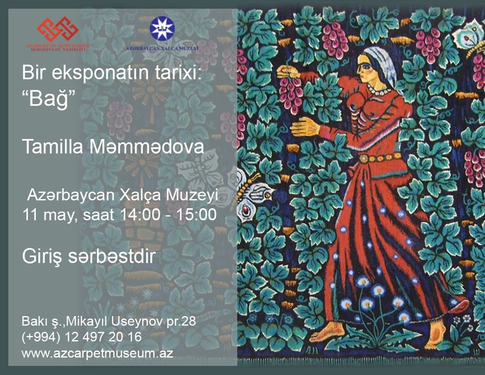 Bir xalça özündə bir çox mühüm tarixi bilgiləri saxlaya bilər, həmçinin bir çox maraqlı ənənələr barədə də məlumat verə bilər. Azərbaycan Xalça Muzeyi sənətsevərləri muzeyin kolleksiyasında saxlanılan "Bağ" divar xalçasının tarixi ilə tanış olmağa dəvət edir. Bütün sirlərin üstünü isə açmağa Azərbaycan Dövlət Rəssamlıq Akademiyasının “Bədii toxuculuq və xalça sənəti” kafedrasının professoru Tamilla Məmmədova kömək edəcək. Giriş pulsuzdur.