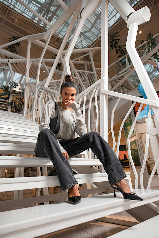 Top & jeans: MIU MIU; shoes: PRADA; bag: THE ROW; jewellery: HERMES