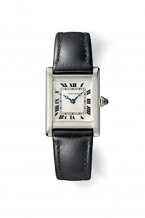 Дебютные часы Tank представляли собой четкий квадратный циферблат, вписанный в прямоугольный корпус, образованный особыми деталями – бранкардами, соединявшими ушки и ремешок. Такой плавный переход от корпуса к креплениям стал настоящим прорывом в часовом дизайне. Графичность циферблату придавали ставшие впоследствии характерными для Cartier римские цифры и Chemin de Fer («железная дорога») – двойная замкнутая линия с минутными делениями. Секрет особого шарма часов Cartier Tank кроется во многих деталях и характерных чертах: свой вклад вносят и циферблат с римскими цифрами, стрелками из вороненой стали и минутной разметкой в форме железнодорожных рельсов, и заводная головка, украшенная сапфиром огранки кабошон. Tank был часами для эстетов и творческих личностей, усматривавших в них нечто большее, чем просто занятный аксессуар. Культовые часы красовались на запястьях Алена Делона, Катрин Денёв, Ива Монтана, Энди Уорхола, Шарлотты Рэмплинг и многих других знаменитостей «Я ношу их не для того, чтобы следить за временем», – заявил как-то Энди Уорхол. Это была возможность приобщиться к эстетическому коду, культурному таинству, великой истории Cartier.