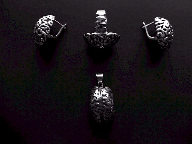 Continuing creative experiment, Chinghiz Babayev creates silver replicas of his own sculptures, giving new function to the art objects. Conceptual decorations require intellectual reflection and raise a series of philosophical questions. Pursed lips, bright magic amulet in the form of an eye, the bracelet gently embracing a wrist with "hands" – each of these ornaments becomes the carrier of cultural meanings and refined metaphors which could be read only by experts