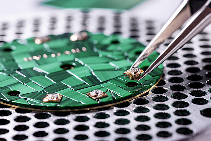 Crafted in either rose gold, lavishly set with diamonds, or in sleek steel, the elegantly slimmed-down, polished bezel frames a captivating dial, either in mother-of-pearl Intarsia or malachite marquetry. The signature Intarsia technique extols light, showcasing the organic iridescence of mother-of-pearl, a precious treasure of the seas, and adds a refreshing take on the sunray finish of watch dials. Artisans assemble ‘rays’ of finely cut mother-of-pearl – a task demanding the highest precision given the material’s brittleness – to create a sunburst pattern with three-dimensional pleating. In white or green mother-of-pearl, depending on the version, this shimmer born of nature itself enhances Lucea’s radiant allure.