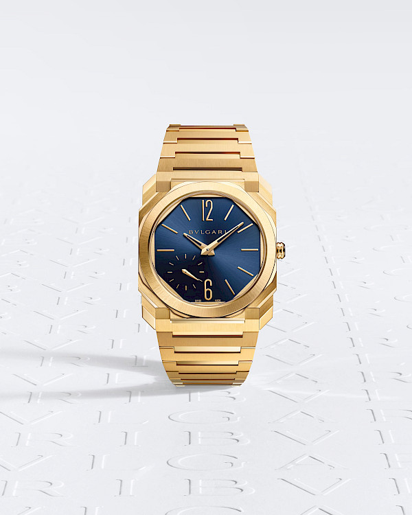 Yellow gold is fused with Octo Finissimo, casting its timeless aesthetic in a new light. This precious metal not only reflects Bulgari’s historic mastery of goldsmithing, but also evokes the fascinating lustre of vintage luxury watches. The sun-like glow of the gold enhances the play of light across the watch’s bold lines and Roman-inspired geometry. The case, with its 58 facets, exhibits exquisite finesse with architectural angles, leading to a satin-finished yellow gold bracelet of exceptional comfort, completed by a triple-blade folding clasp. The dial, lacquered in deep blue with a sunray finish, completes the gold’s lavishness. Golden, contrasting hands and hour markers ensure outstanding legibility, befitting a chic, sporty timepiece. With a diameter of 40 mm and a slimness of just 6.4 mm, the new Octo Finissimo appeals to both men and women, confirming its versatility along with a remarkable water resistance up to 100 m. The transparent caseback reveals the art of Swiss mechanical excellence: the in-house BVL 138 calibre, extraordinarily slim at just 2.23 mm, is beautifully adorned with hand-finished chamfers, circular graining, and Côtes de Genève stripes.