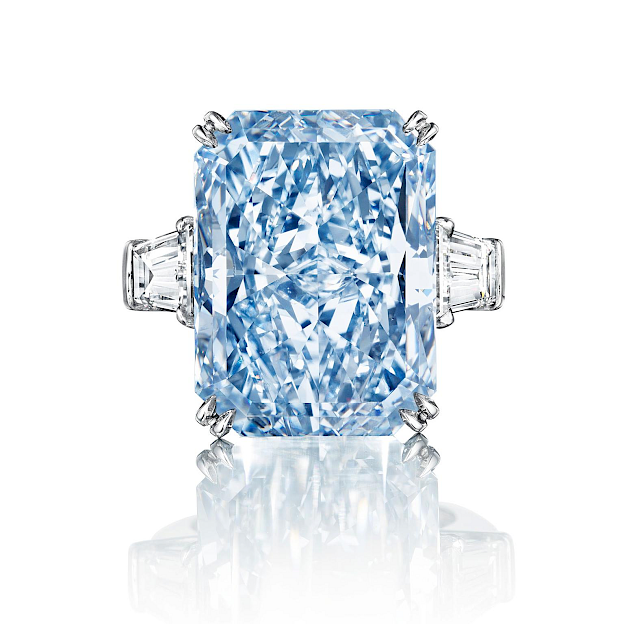 The most expensive diamond rings ever sold at auction is the 24.18 carat, Cullinan Dream. The largest Fancy Intense blue diamond to ever appear at auction, this beautiful rectangular mixed-cut stone is set onto a platinum ring with baguette-cut diamond side stones. Like the Oppenheimer Blue, the Cullinan Dream comes from the South African mine of the same name and is the largest of four gems cut from a 122.52 carat rough blue diamond unearthed in 2014. The 24.18ct Cullinan Dream - the largest Fancy Intense blue diamond to ever appear at auction - sold for $25.4 million at Christie’s New York in June 2016.