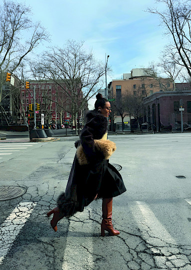 Coat CHARLOTTE SIMONE, bag RACHEL COMEY, sweater JIL SANDER, skirt PRADA, boots PARIS TEXAS