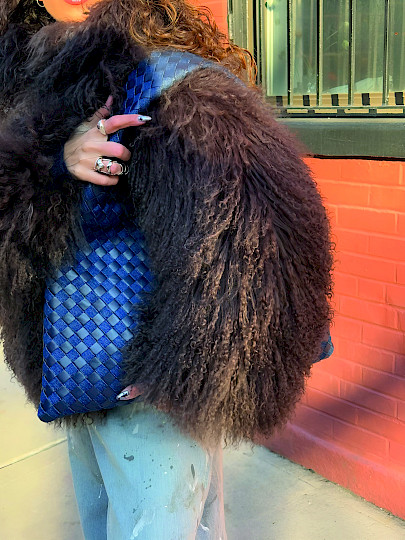 Sunglasses and bag BOTTEGA VENETA, coat Vintage, jeans ACNE STUDIOS, boots PRADA