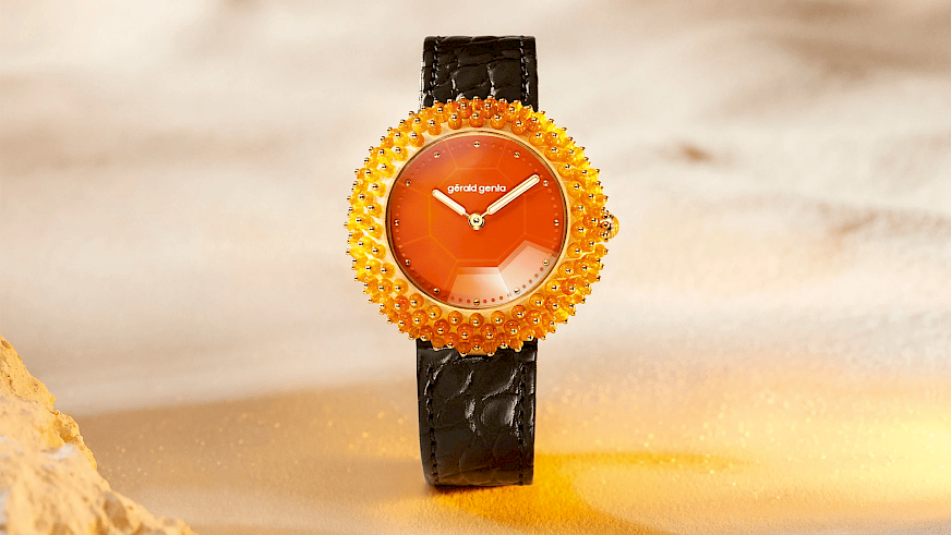 Introducing the latest and perhaps the most Gentissima piece, the Oursin Fire Opal radiates warmth and energy in every detail. This fourth piece in the Gentissima Oursin collection comes straight from the gerald genta lab, where design and creativity push the boundaries of horological traditions. The legacy of Mr. Genta strikes at first sight in terms of aesthetics and construction, with individually screwed hie opal gems surrounding the circumference of the yellow gold case of this limited-edition watch. This piece aligns with the Maison's philosophy of being the starting point for those looking for distinction and elegance in a collection that allows for endless creative possibilities.