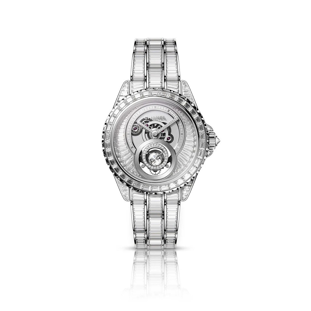 Limited to 12 pieces, the J12 Diamonds Tourbillon Calibre 5 features the first in-house mechanical tourbillon movement developed by the Chanel Watch Manufacture. The dial is set with custom-cut baguette diamonds, while the flying tourbillon cage is adorned with 26 diamonds and a central 0.18-carat diamond.