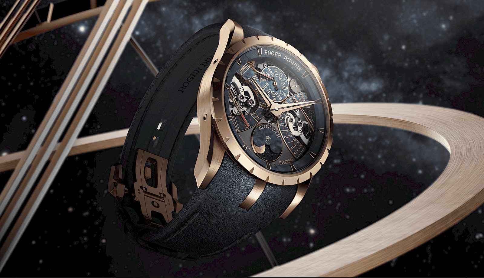 The Excalibur Biretrograde Perpetual Calendar reflects the theme “Movements of the Sky” by tracking time over 122 years with a complex openworked movement.