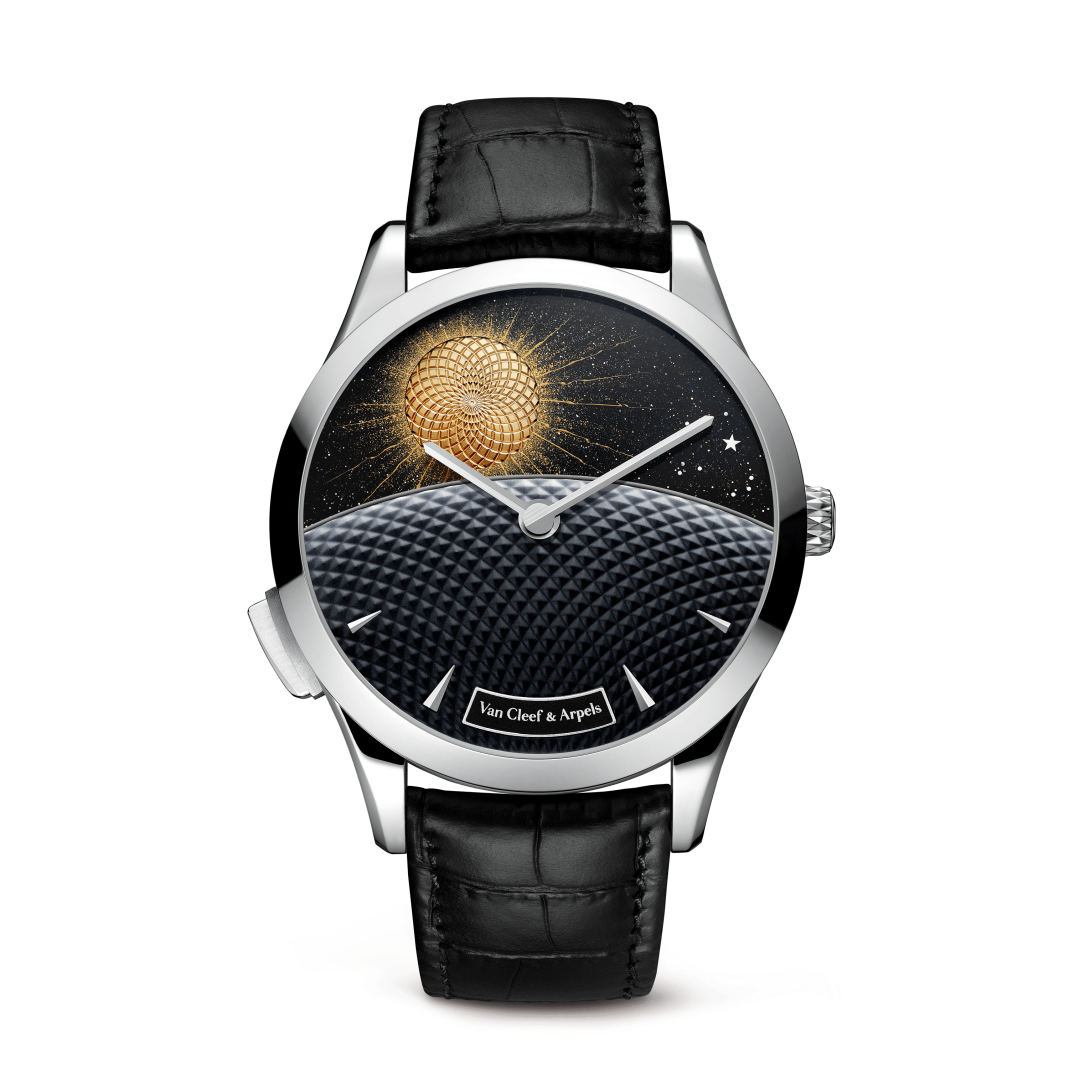 The Midnight Jour Nuit Phase de Lune watch expands the Jour Nuit collection with a poetic tribute to the Moon. Two overlapping complications animate the day/night display and the lunar phases, visible on demand via a dedicated button.