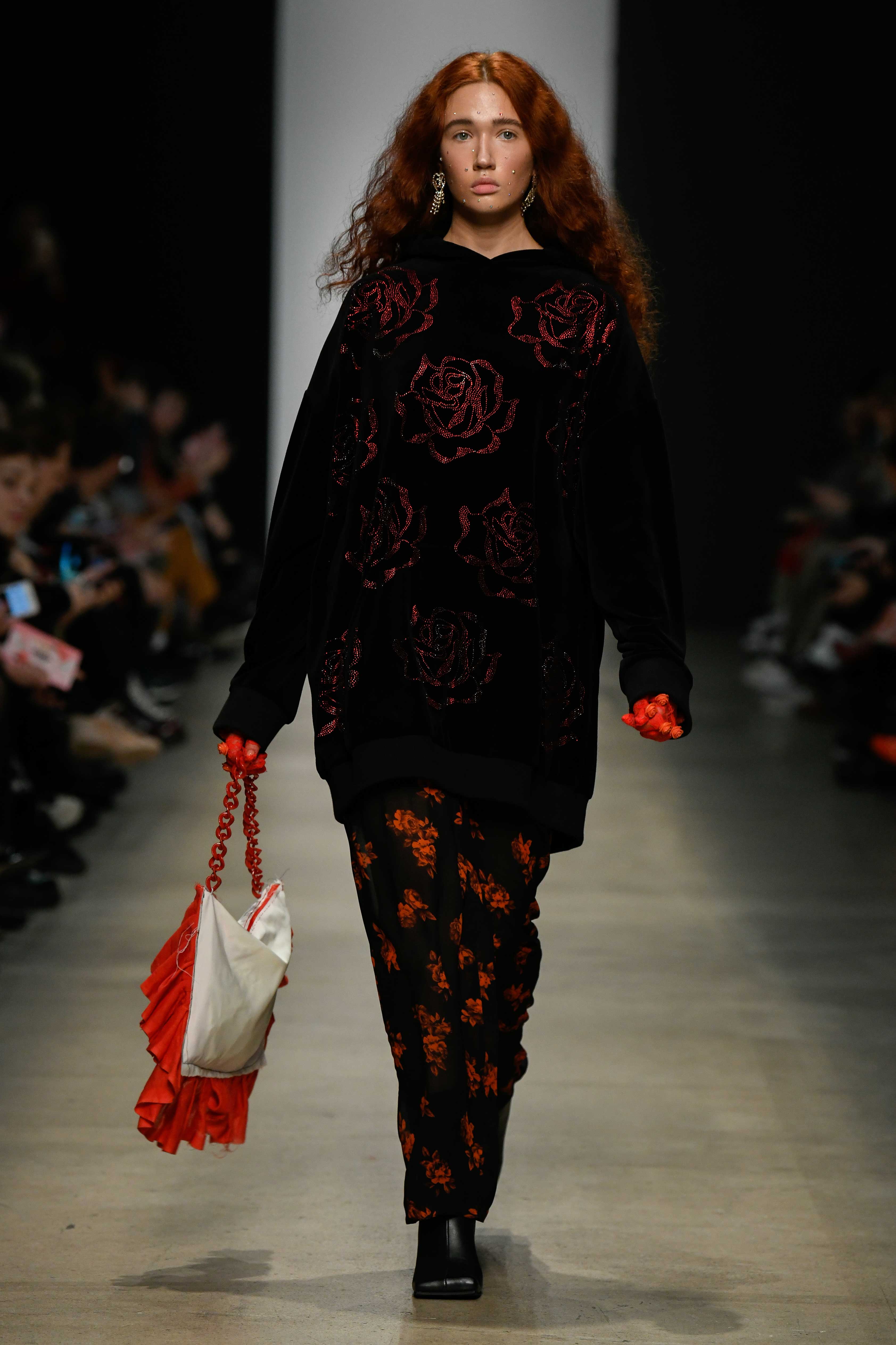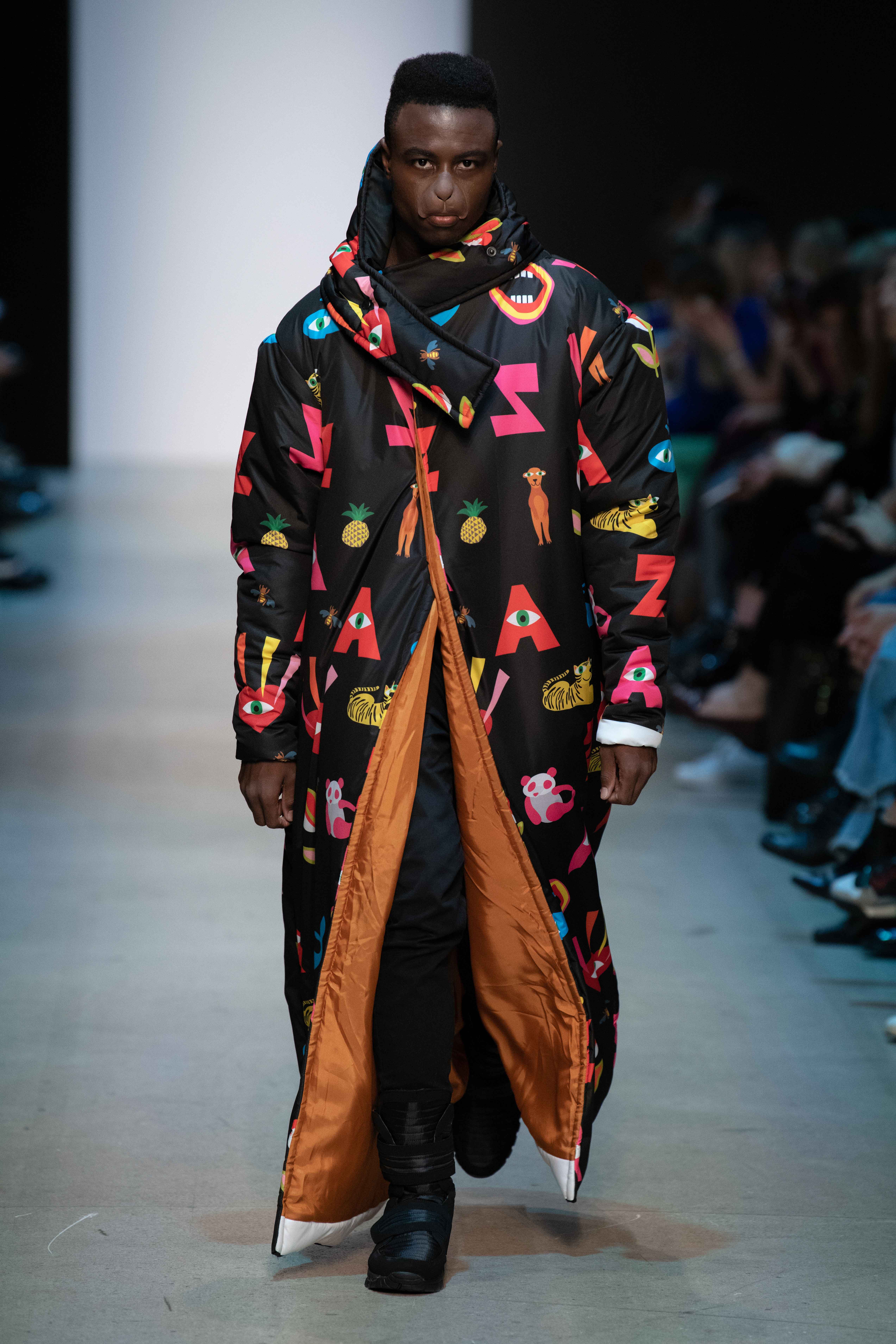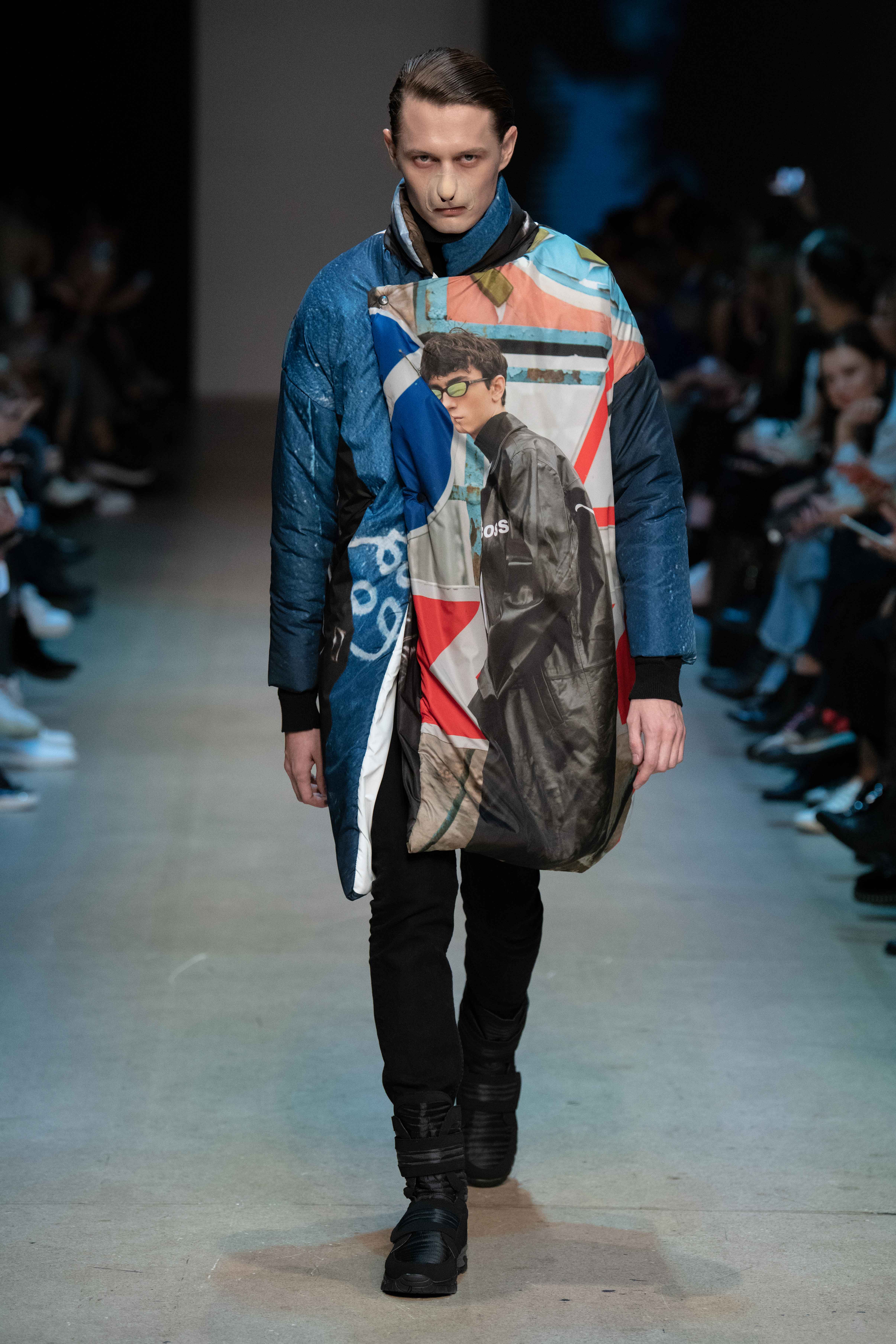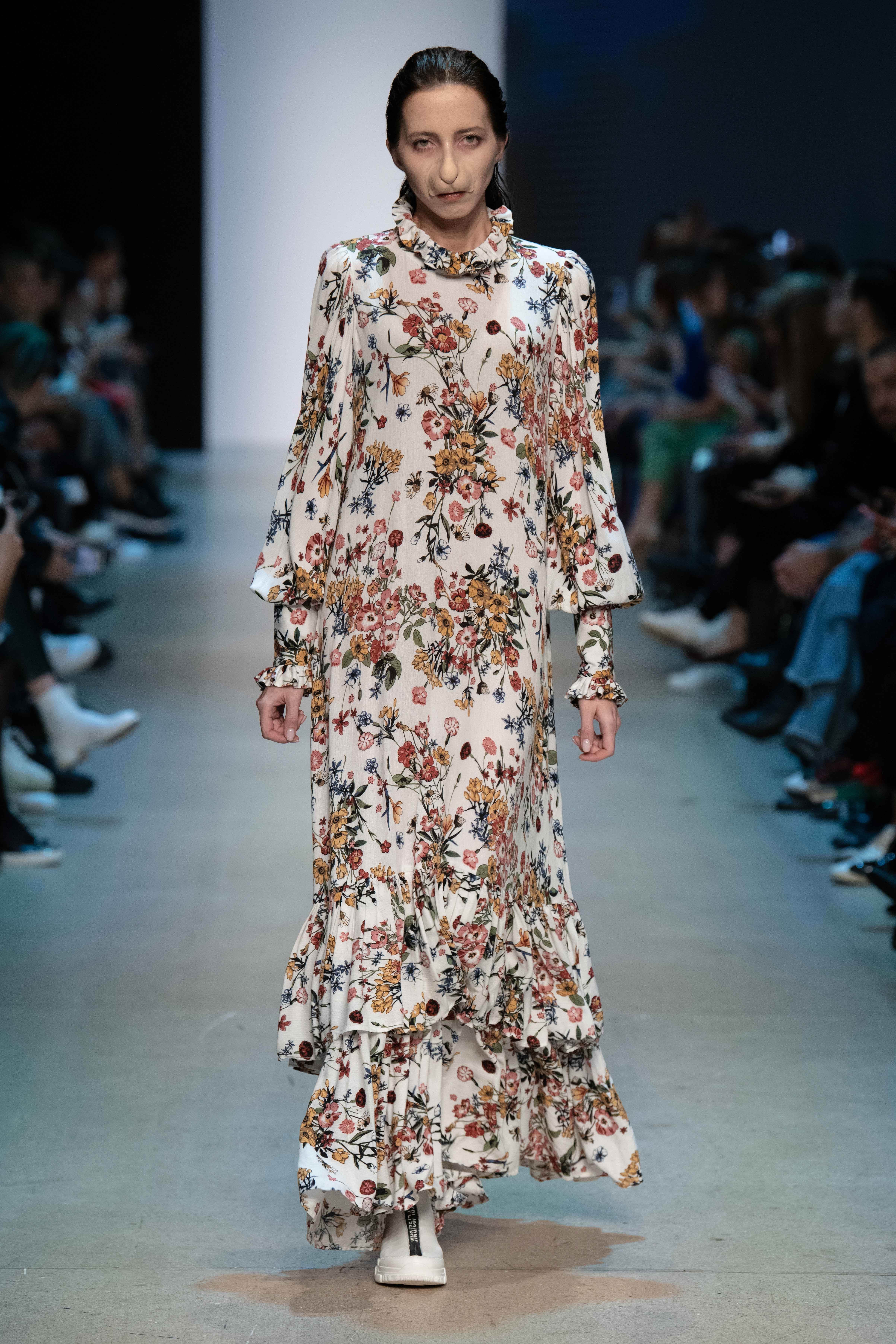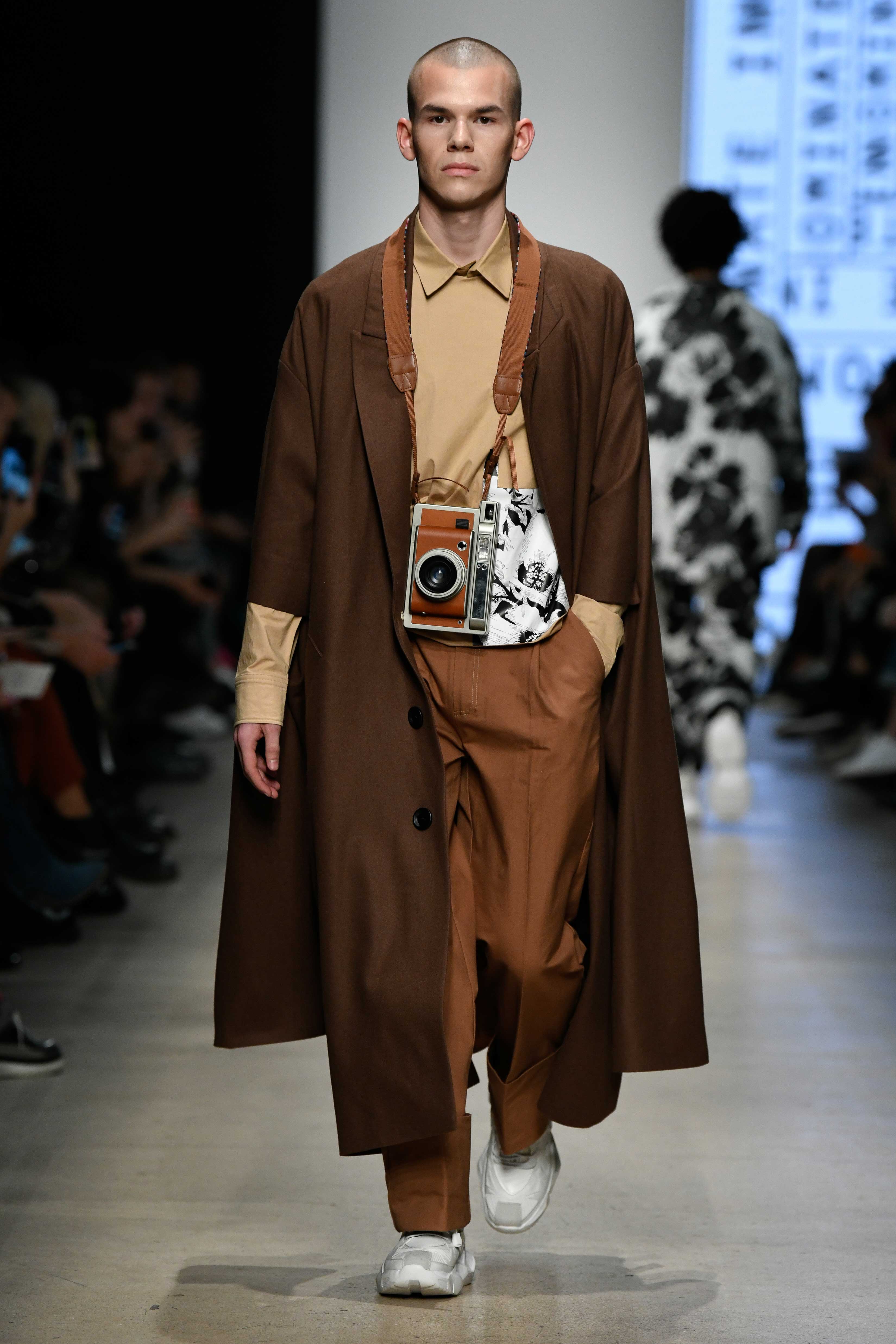 Бренд продолжает экспериментировать, приглашая к участию в показе возрастных моделей. Так, в этот раз модель-мужчина примерил образ в стиле кэжуал, состоявший из грубых ботинок, пальто oversize-кроя и шарфа. В основе коллекции – утилитарные вещи, подходящие для современного поколения, которое так любит авангардное индивидуальное звучание. Сюда вошли безразмерные пальто и тренчи с принтами в виде рисунков и портретов и дутые жилетки-шарфы – все в приглушенных оттенках. Фаворитами сезона стали пастельный розовый, черный, белый и серый.