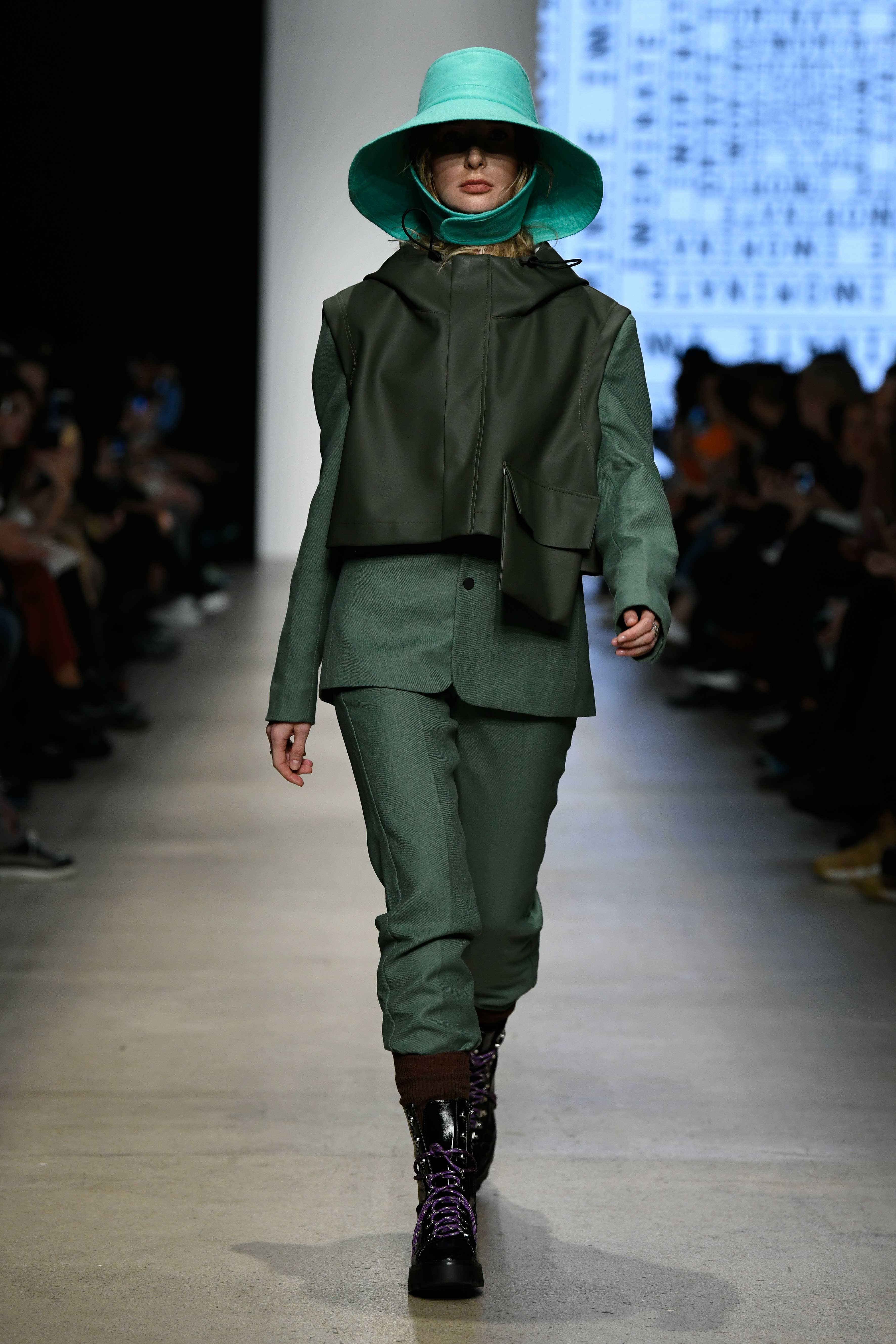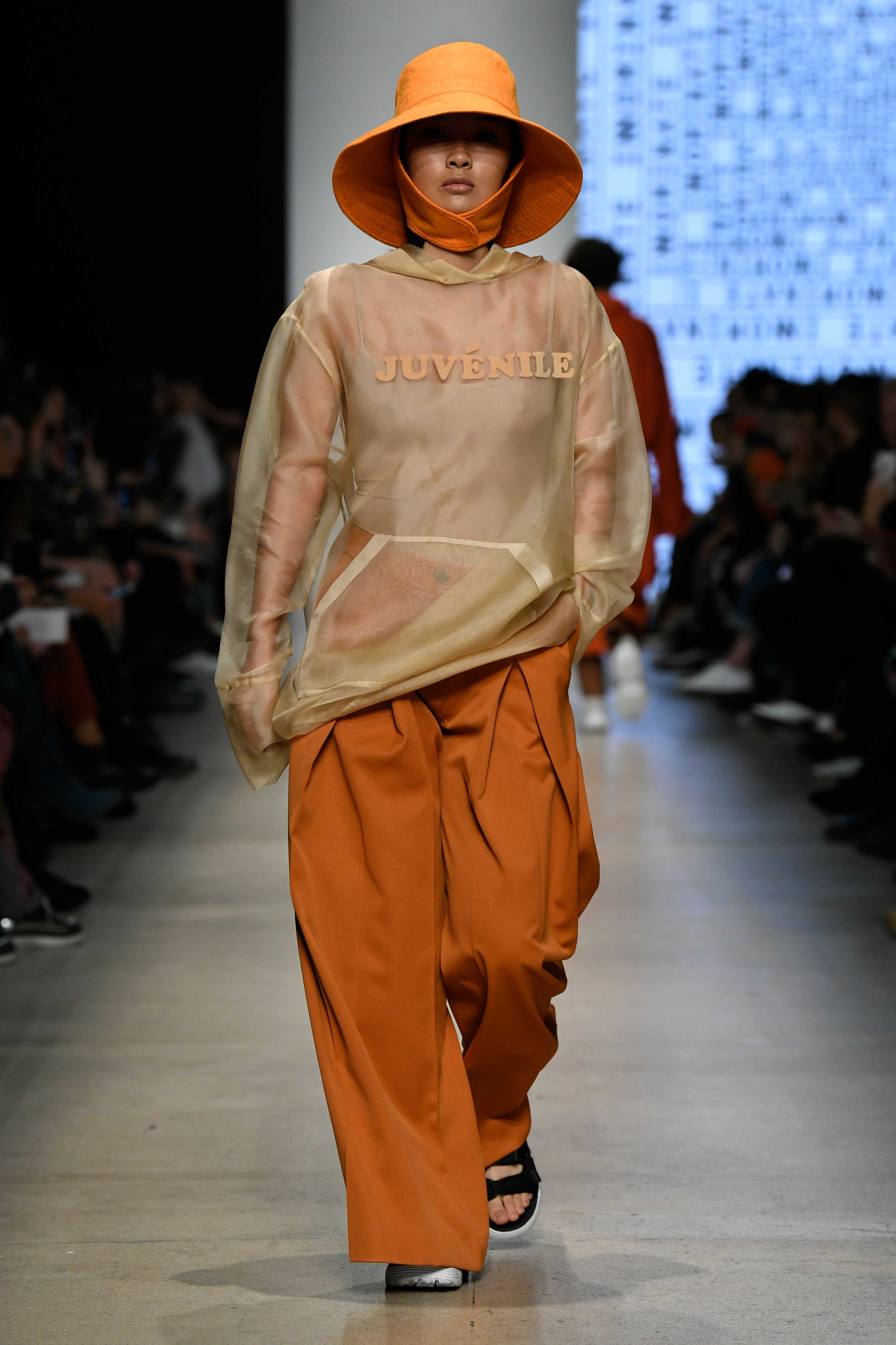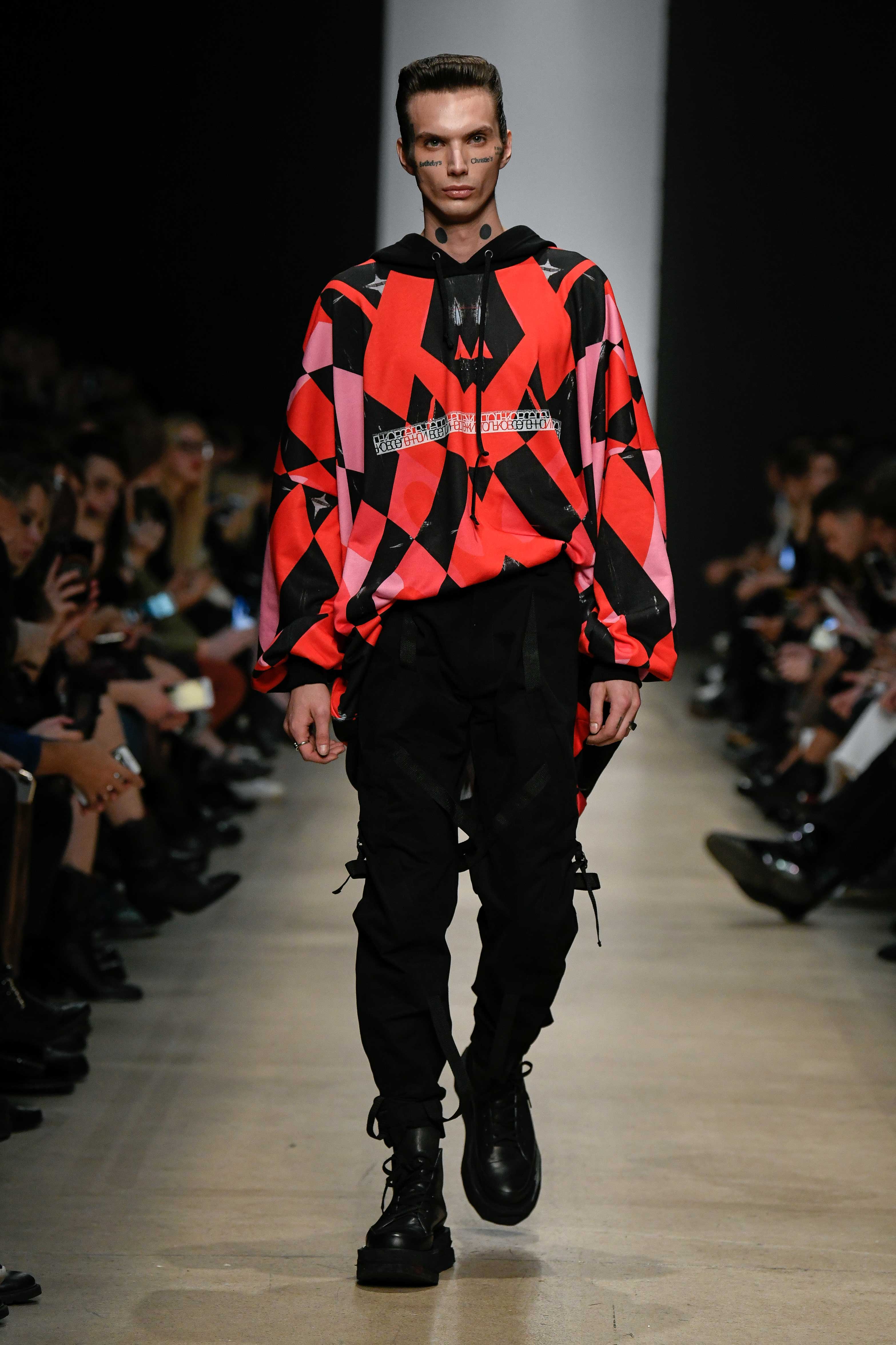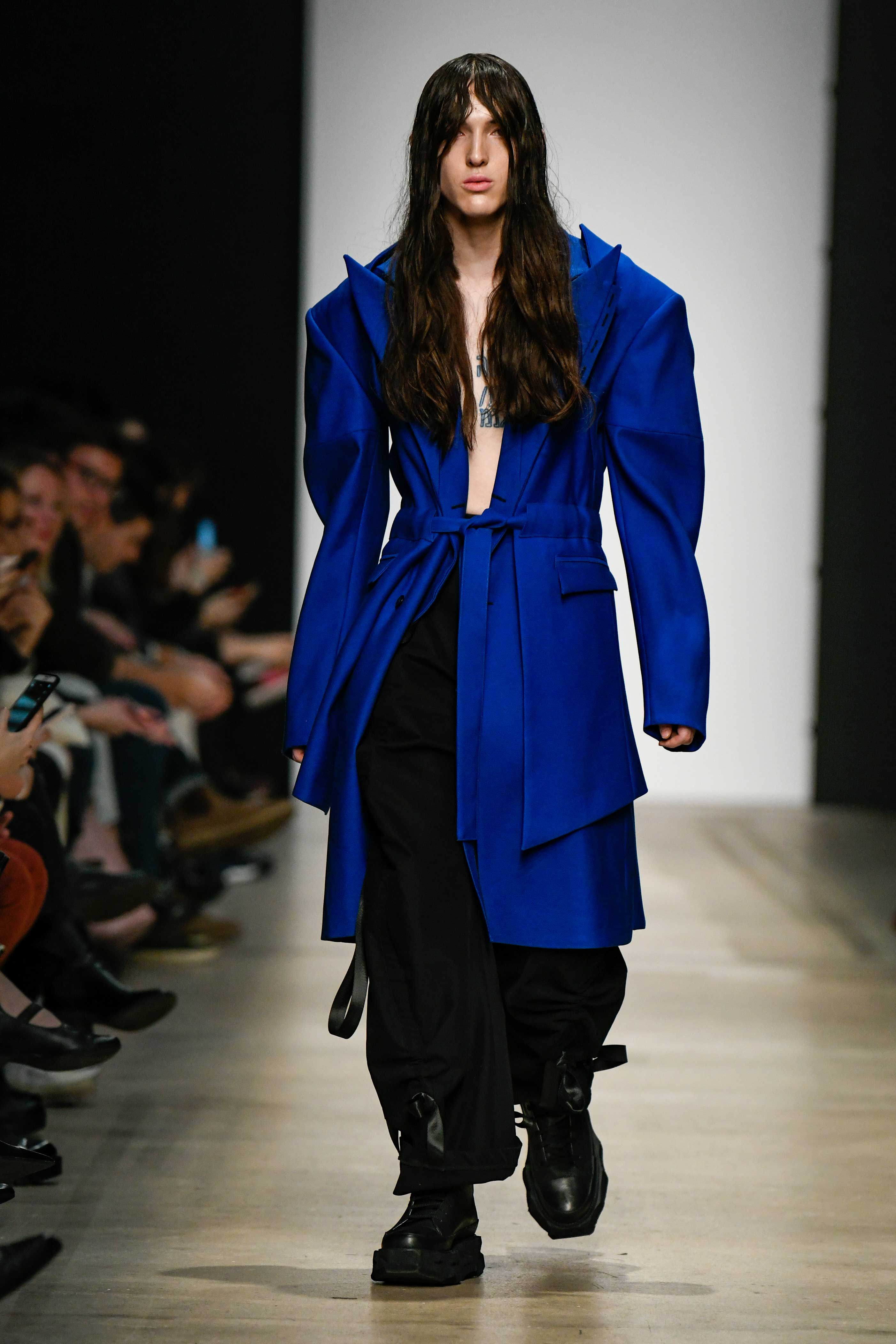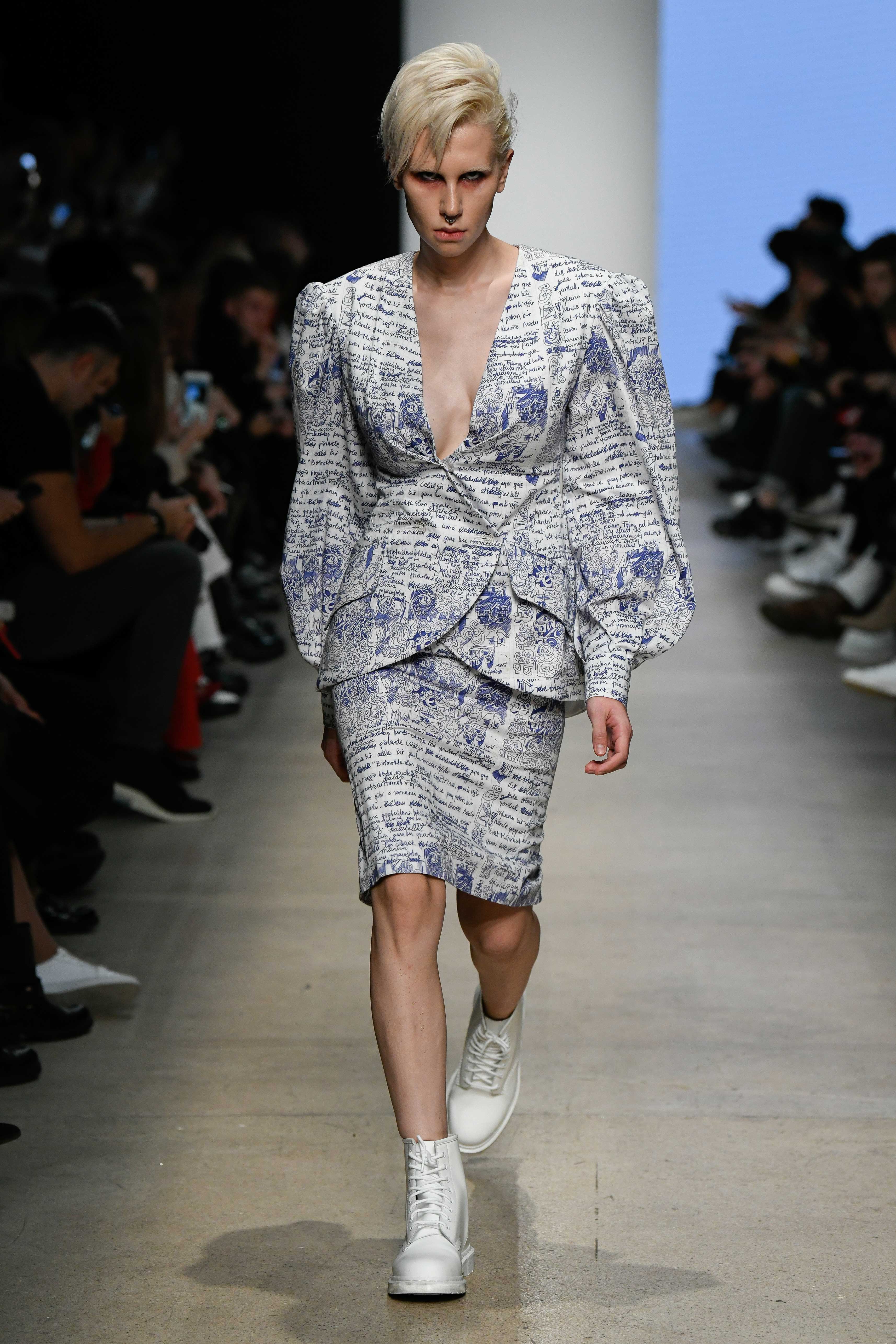 Бренд продолжает экспериментировать, приглашая к участию в показе возрастных моделей. Так, в этот раз модель-мужчина примерил образ в стиле кэжуал, состоявший из грубых ботинок, пальто oversize-кроя и шарфа. В основе коллекции – утилитарные вещи, подходящие для современного поколения, которое так любит авангардное индивидуальное звучание. Сюда вошли безразмерные пальто и тренчи с принтами в виде рисунков и портретов и дутые жилетки-шарфы – все в приглушенных оттенках. Фаворитами сезона стали пастельный розовый, черный, белый и серый.