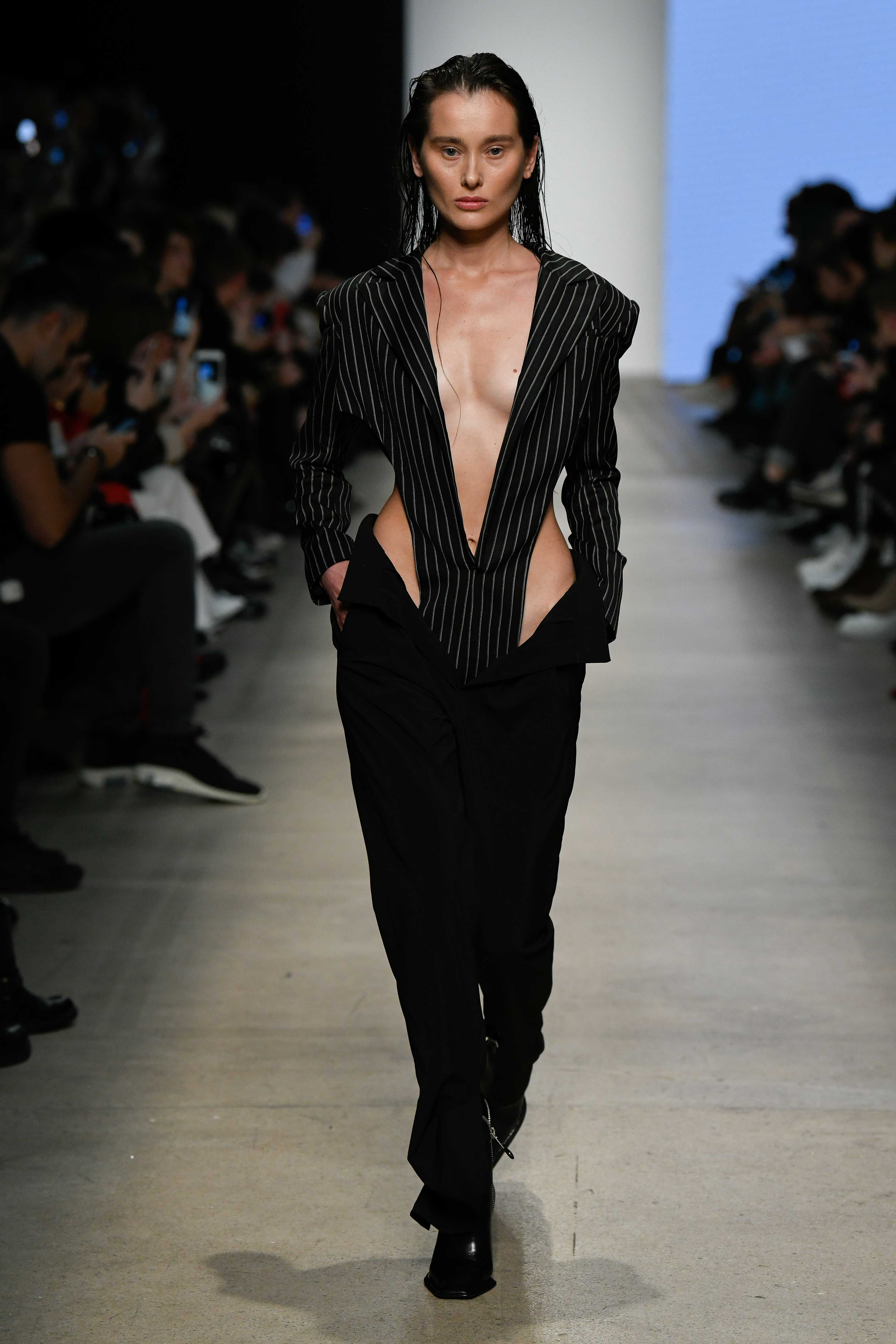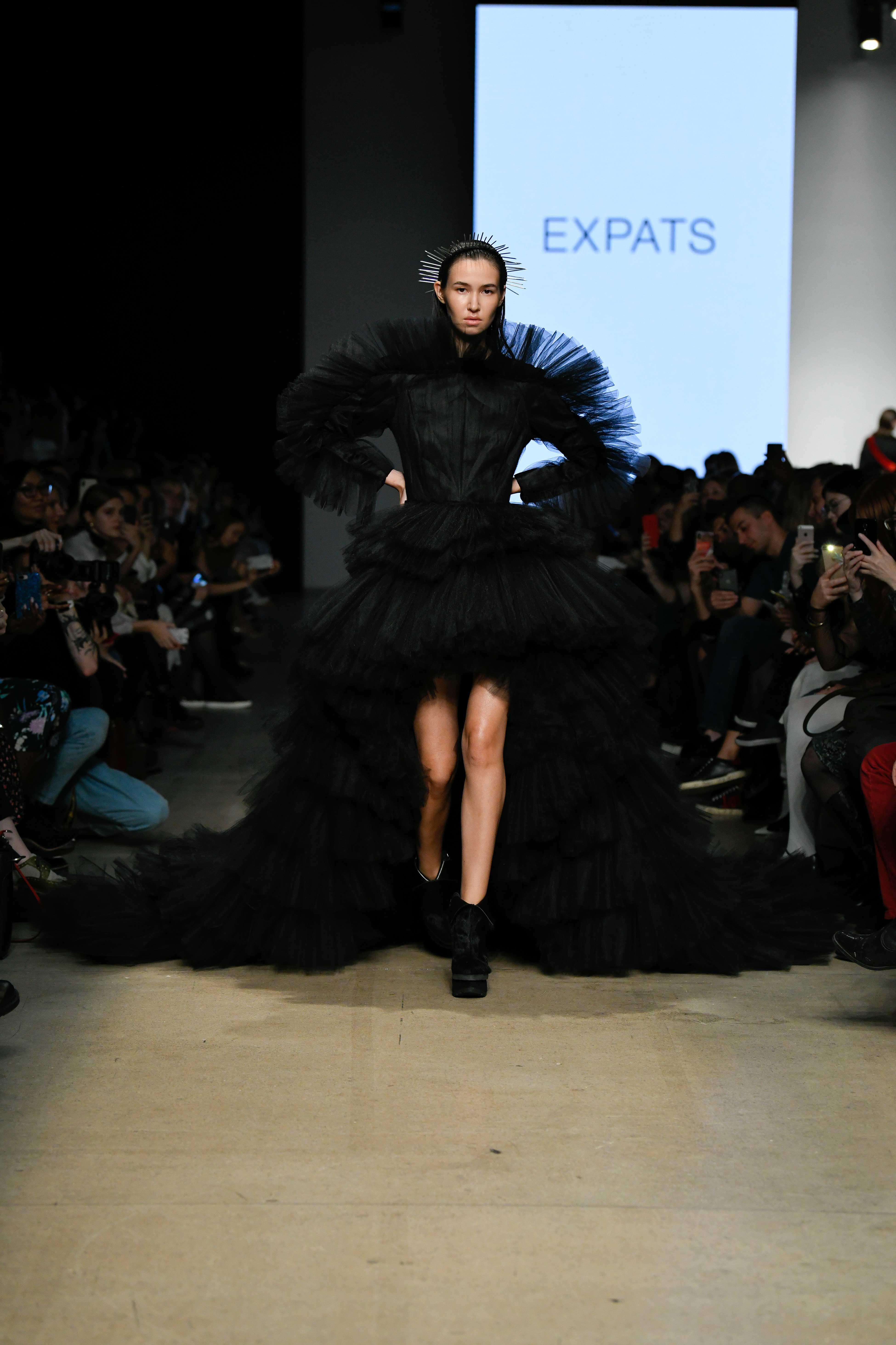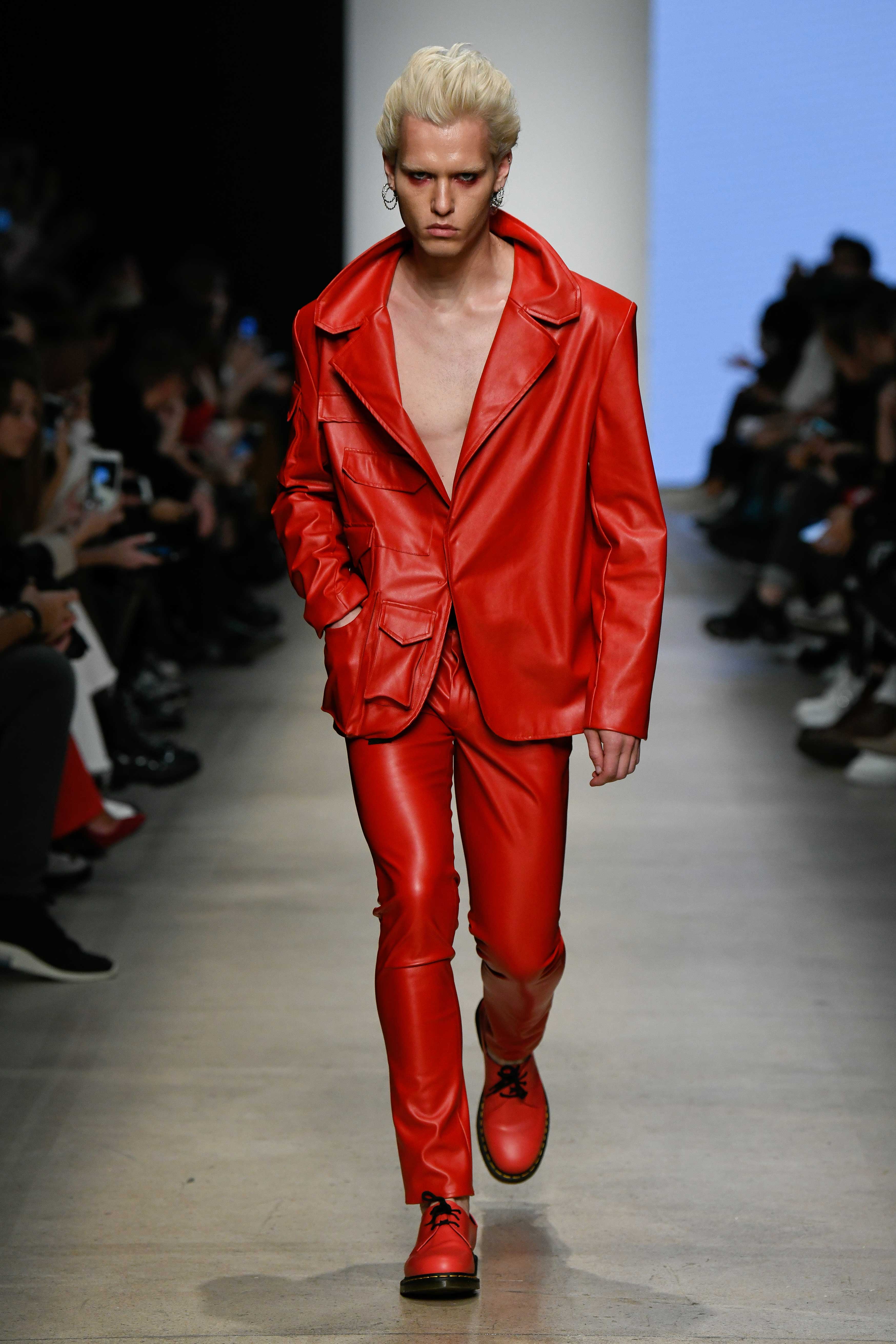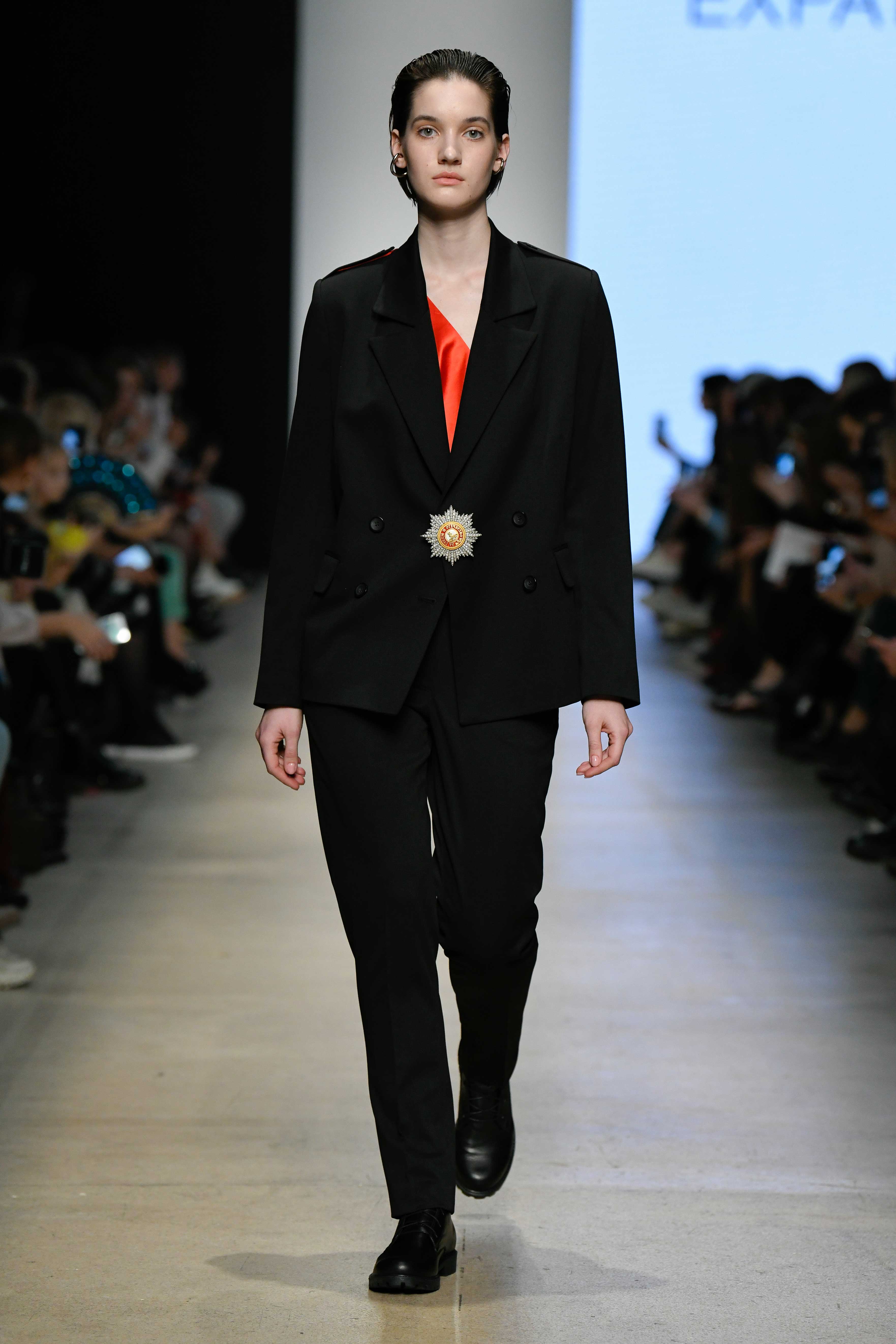 На показе бренда BÁKHTIN модели с взъерошенными волосами дефилировали под альтернативный рок и демонстрировали костюмы с двубортными пиджаками, кожаные плащи, пальто, комбинезоны и платья на одно плечо. Здесь было много кожи и принтов – самым ярким, пожалуй, стал «замощенный» журнал Cool. Основные цвета коллекции – черный и красный.