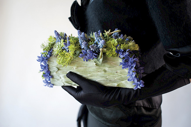 I have made several dresses, a coat and accessories such as scarves and shawls and so on. They are very time-consuming to make. Most of them are for photoshoots, but a few times I have been hired to do botanical jewellery and headpieces for fashion shows, events and weddings. Because the flowers do not have a water source, they only last for a day or two, but that is not any different to the lifespan of corsages and boutonnieres for weddings... It is ephemeral creative work.