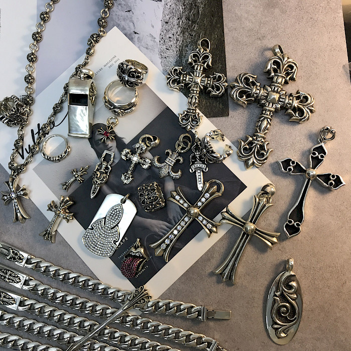 Chrome Hearts (любимый бренд Карла Лагерфельда) — марка, известная своей готической эстетикой. Помимо рок-вибрации, Chrome Hearts — один из первых мейнстримовых брендов готической одежды, украшений и мебели.