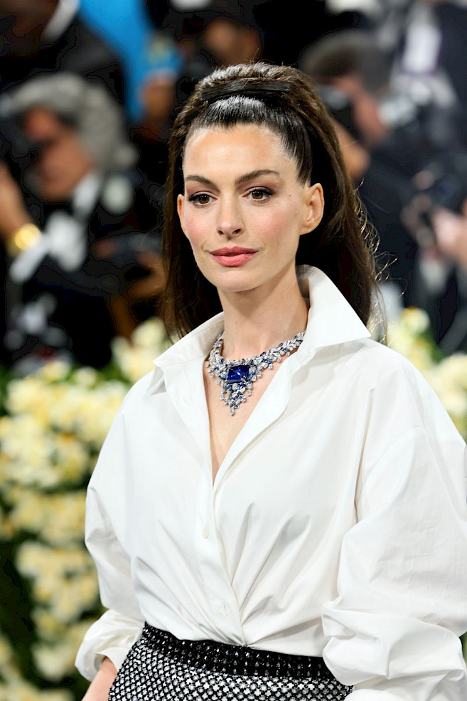 Another magnificent Bulgari necklace took centre stage in Anne Hathaway’s look—a breathtaking statement piece featuring a giant rectangular sapphire framed by sparkling diamonds.