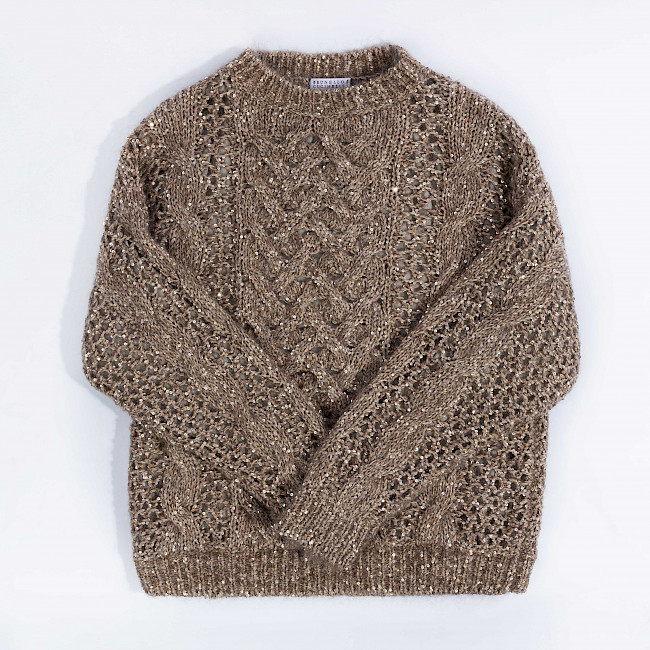 Бежевый свитер из весенне-летней коллекции бренда, поможет сделать образ расслабленнее. К тому же изделие мерцает в лучах света, благодаря сверкающим пайеткам, вплетенным в состав мягкой пряжи. В ней объединили нежный мохер и мягкую шерсть альпаки, поэтому вещь не колется и особенно приятная на ощупь.