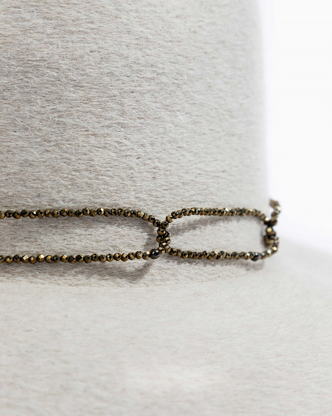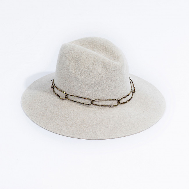 Бежевая широкополая шляпа из фактурного кроличьего фетра. Элегантный аксессуар украшен съемной цепочкой из граненых бусин, которую можно использовать как ожерелье.