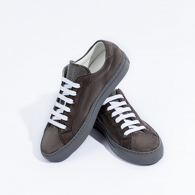 Темно-серые кеды из мягкой бархатистой замши достаточно нейтральны, но в то же время не лишены индивидуальности за счет широкого язычка, который украсили цепочками Мониль, мерцающими на свету.
