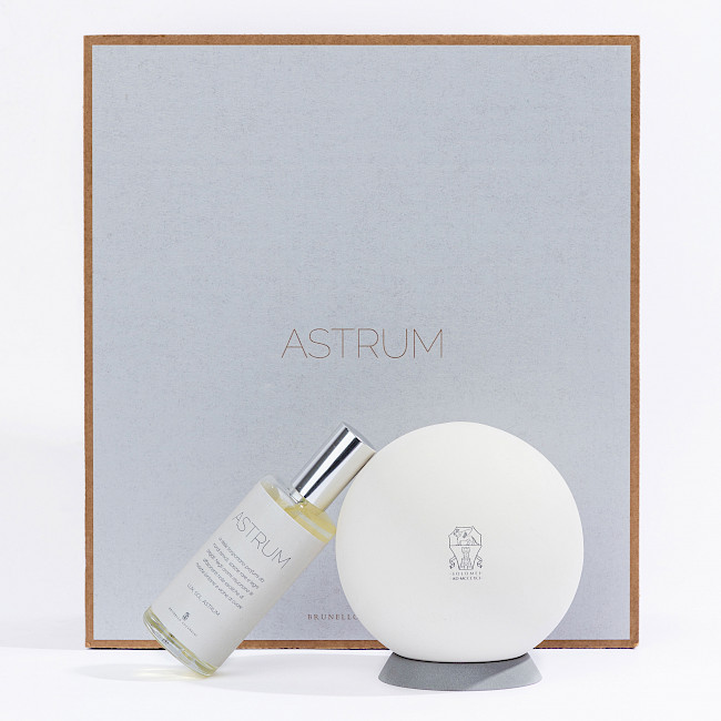 Известно, что воспоминания тесно связаны с ароматами, а самый приятный из них – запах родного дома. Аромадиффузор для дома от Brunello Cucinelli представляет собой лаконичную сферу из гипса, персонализированную логотипом Solomeo и оснащенную основанием из материала Krion. Аромат, содержащийся в запасной стеклянной бутылочке, – это эссенция Astrum, один из трех новых ароматов с древесными нотами, который погружает нас в атмосферу вечерних часов у камина.