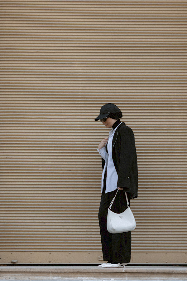 Черный блейзер Wonder Wander Shop, белая рубашка, черные брюки MIU MIU, черная кепка TOTEME,