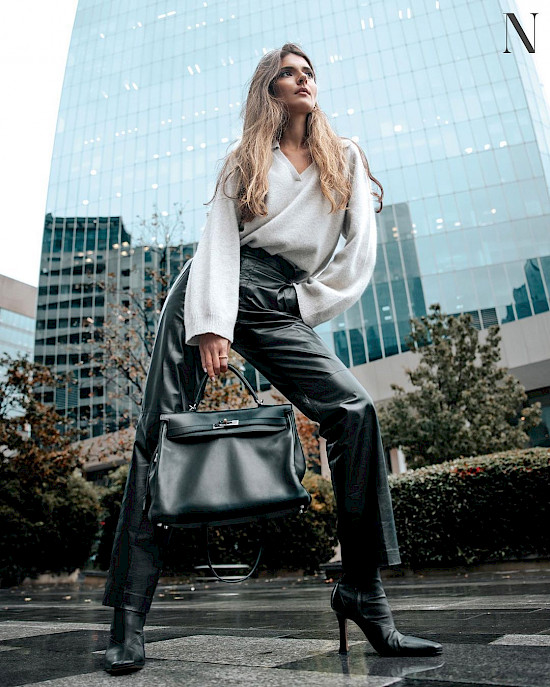 Jumper LOULOU STUDIO, pants HELMUT LANG, boots CELINE, bag HERMÈS, jewellery CARTIER