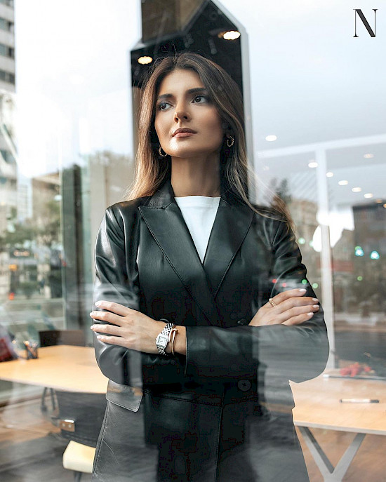 Jacket MASSIMO DUTTI, t-shirt VINCE, jewellery CARTIER