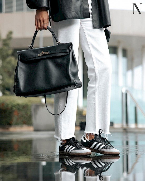 Shirt THEORY, jeans RE/DONE, sneakers ADIDAS, bag HERMÈS, jewellery CARTIER